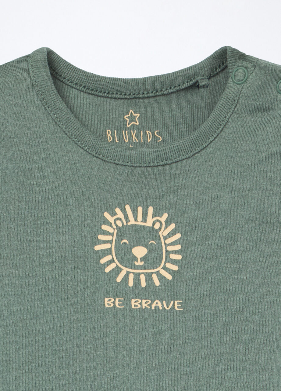 Bodi od rebrastog čistog pamuka s okruglim izrezom i kratkim rukavima. Print sprijeda. Kopčanje pritiskivačima između nogu i na ramenu.