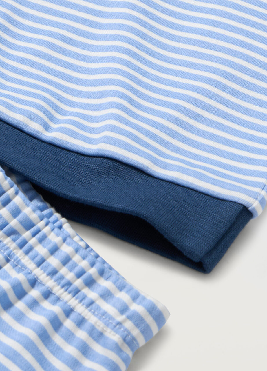 Dugi komplet pidžame od čistog pamuka s uzorkom pruga. Gornji deo s okruglim izrezom, štampa na prednjoj strani. Ogrtač, manžet, PYJAMAS