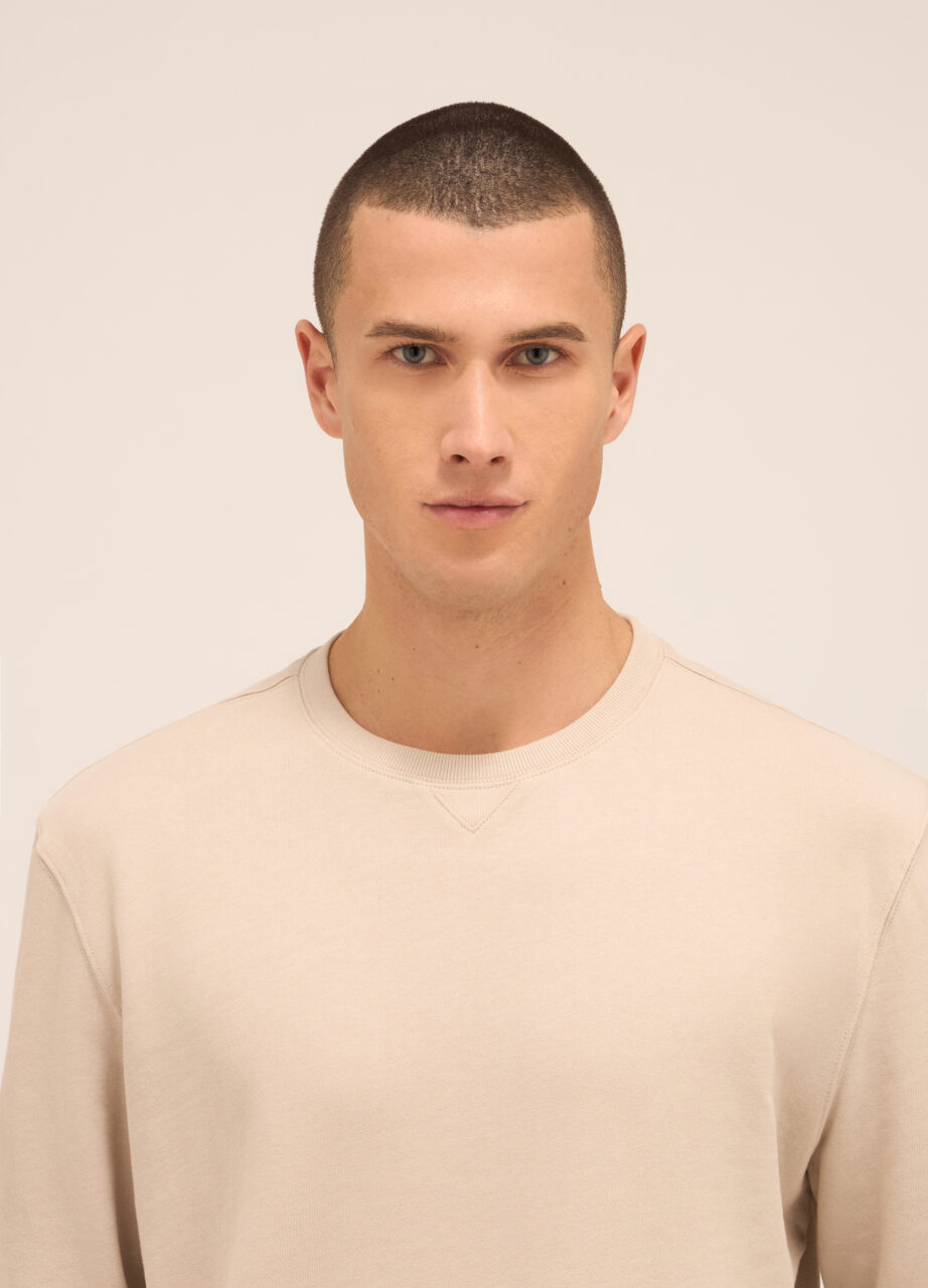 MEN’S T-SHIRTS, Bež dukserica izrađen od čistog pamuka, lagan i udoban, savršen za opuštanje. Model sa dugim rukavima i regularnim krojem sa rebrastim detaljima na okruglom izrezu.