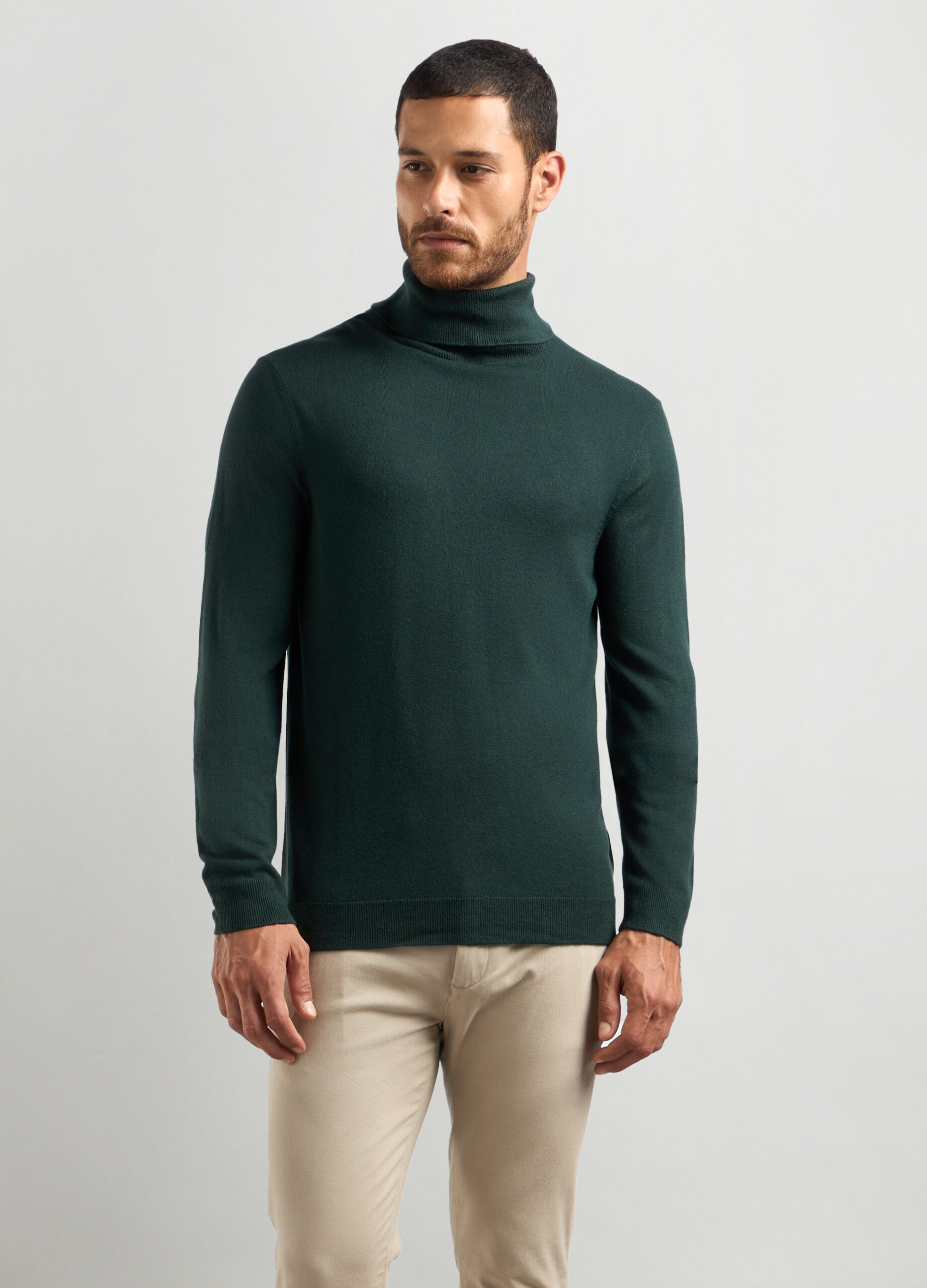 Jednobojni dolčevita pulover od trikotaže. Ovratnik, donji rub i manžetne su u rebrastom stilu.