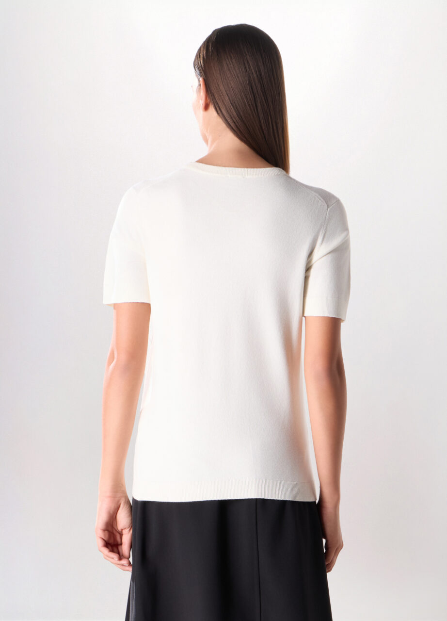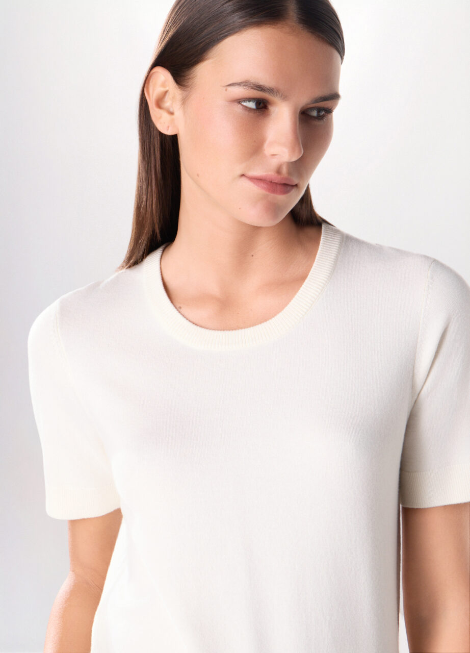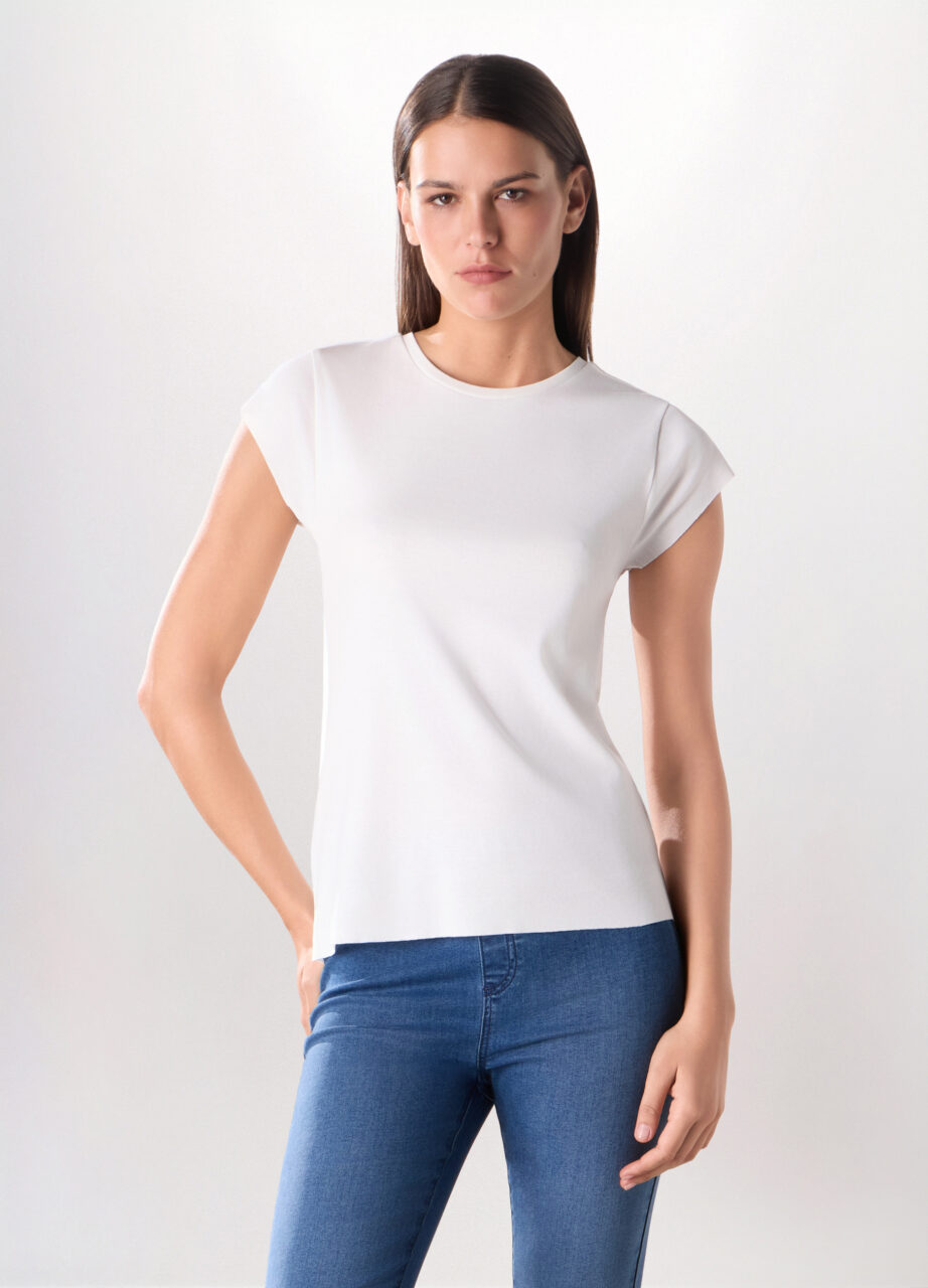 Majica od mješavine viskoze sa okruglim izrezom, rebrastim donjim rubom i manžetnama. Jednobojna.