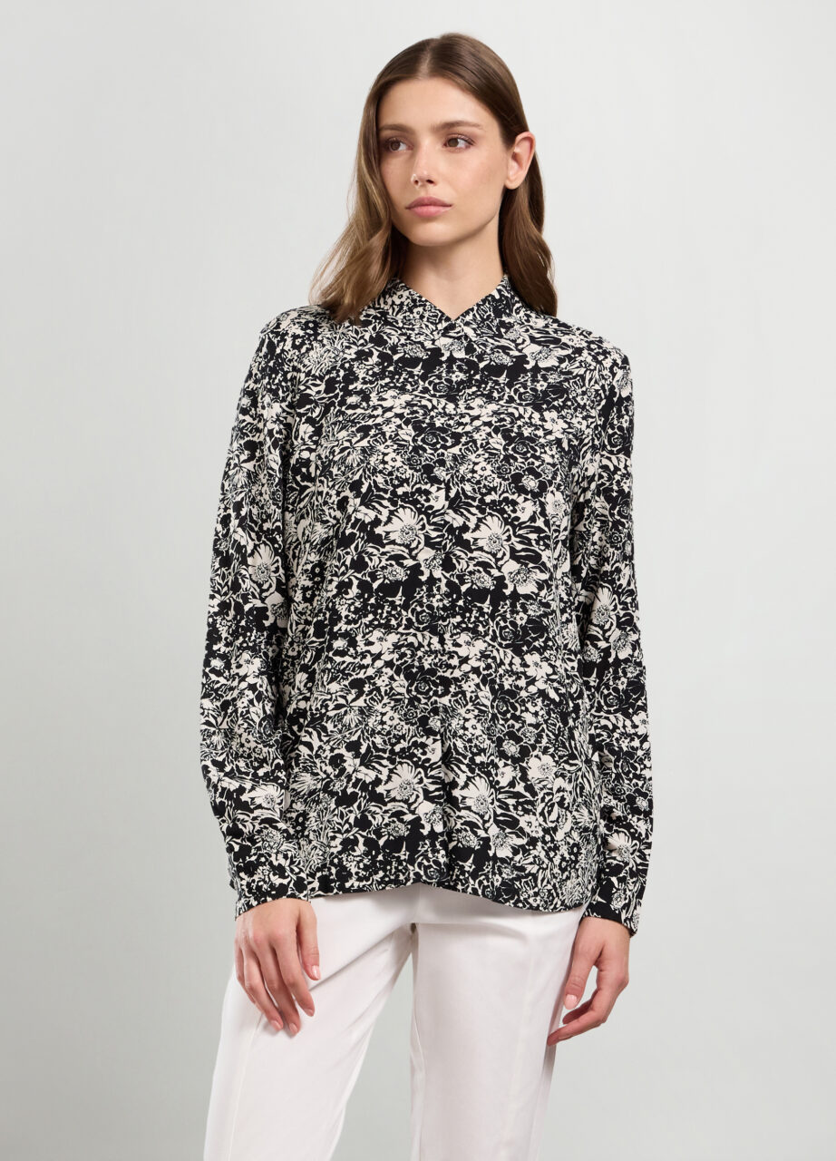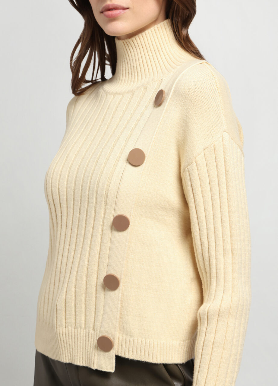 džemper od mješavine viskoze s visokim ovratnikom i jacquard prugama. Ovratnik, donji dio i manšete su u kostrijetu. Aplikovani dugmići sprijeda., SWEATER