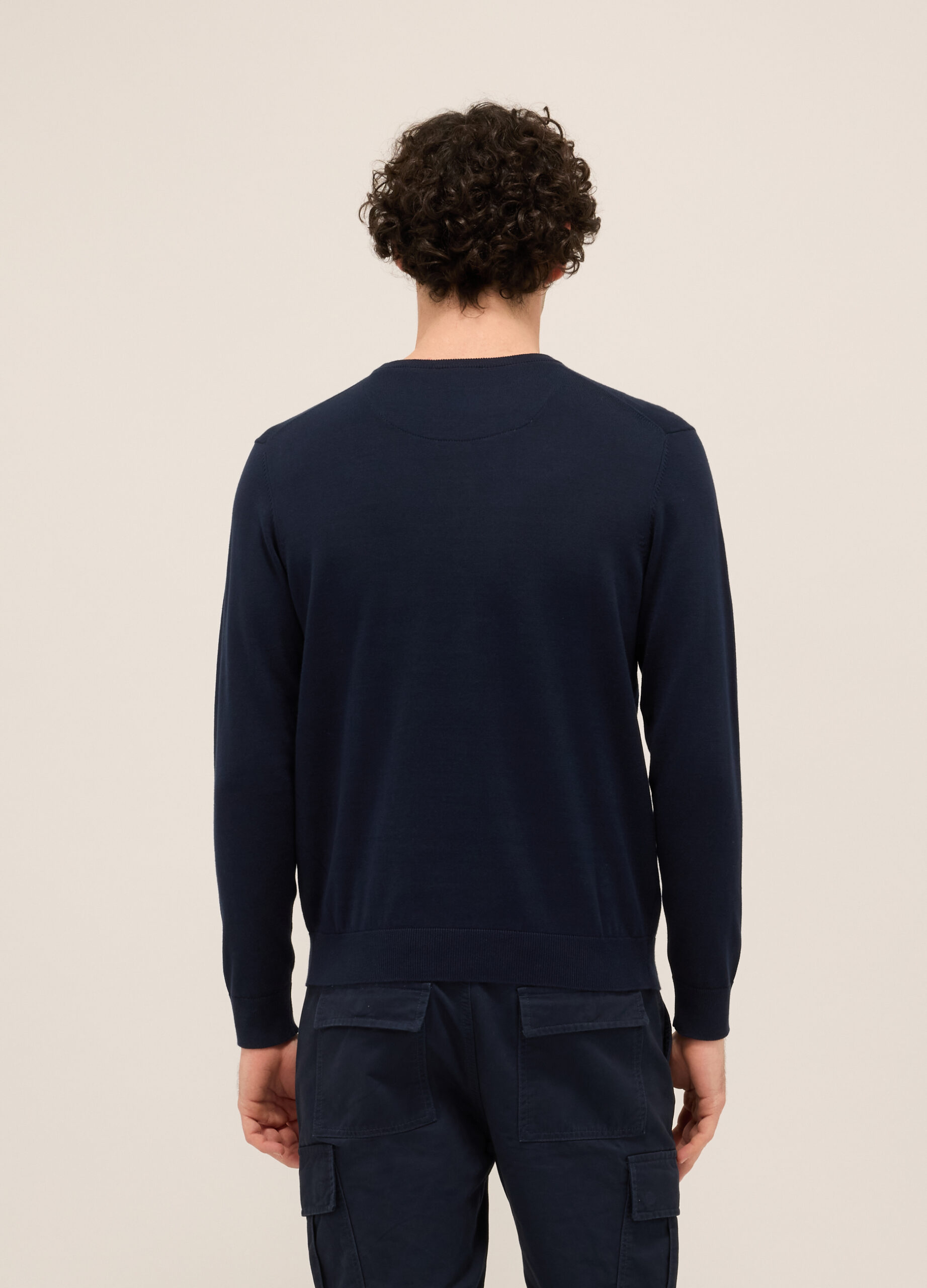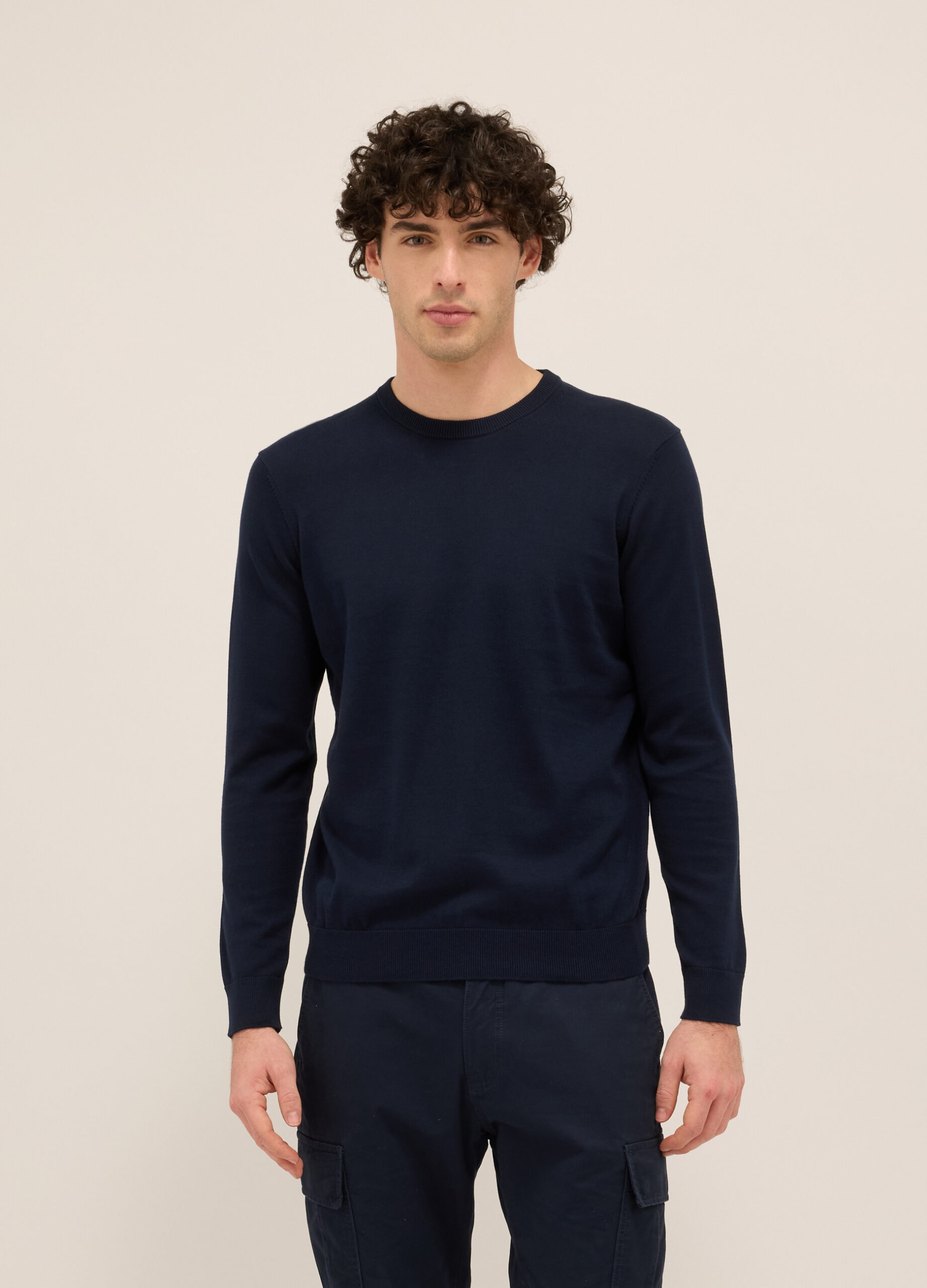 MEN’S SWEATERS, Džemper pleten od čistog pamuka tamno plave boje, sa laganom i udobnom teksturom za svakodnevne kombinacije. Regular kroj sa rebrastim rubovima.