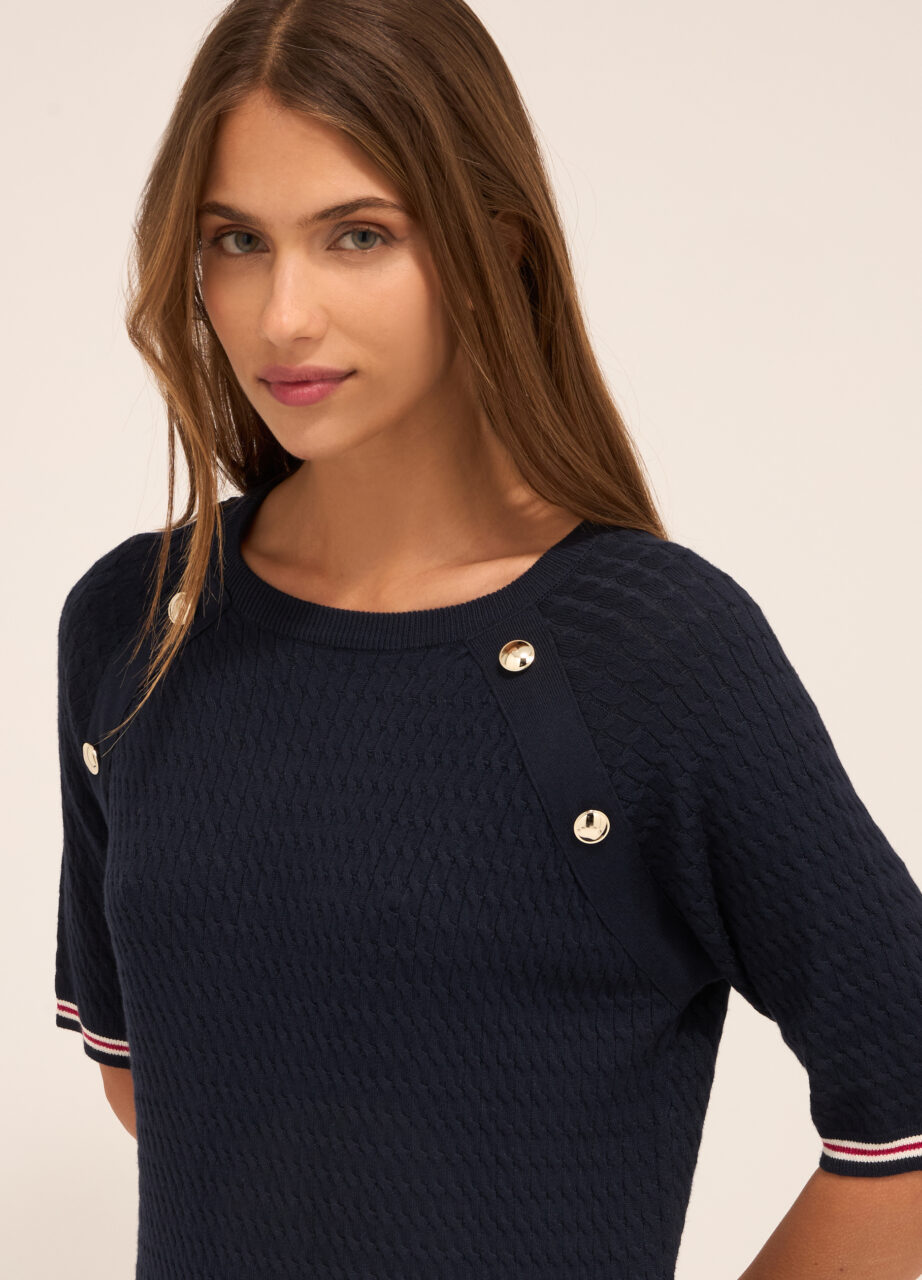 WOMEN’S SWEATER, Džemper od mješavine viskoze sa kratkim raglan rukavima i pletenjem u obliku pletenice. Aplikirani dugmadi na prednjem dijelu. Donji rub i manžetne u rebrastoj pletenini s prugama.