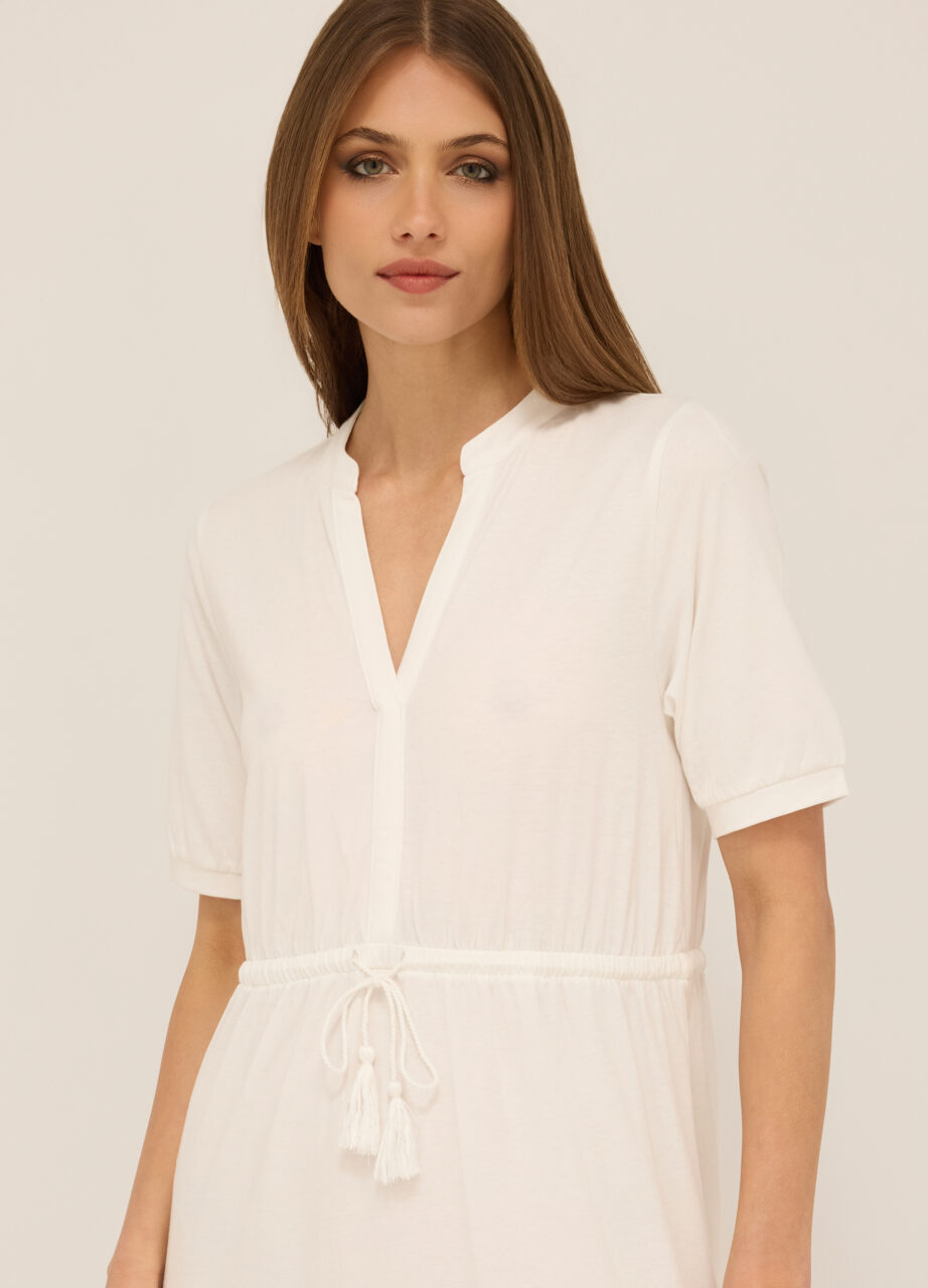 Duga haljina od jerseya od čistog pamuka s V-izrezom i kratkim rukavima. Donji dio s vezom. Pojas na vezanje u struku. Jednobojna.