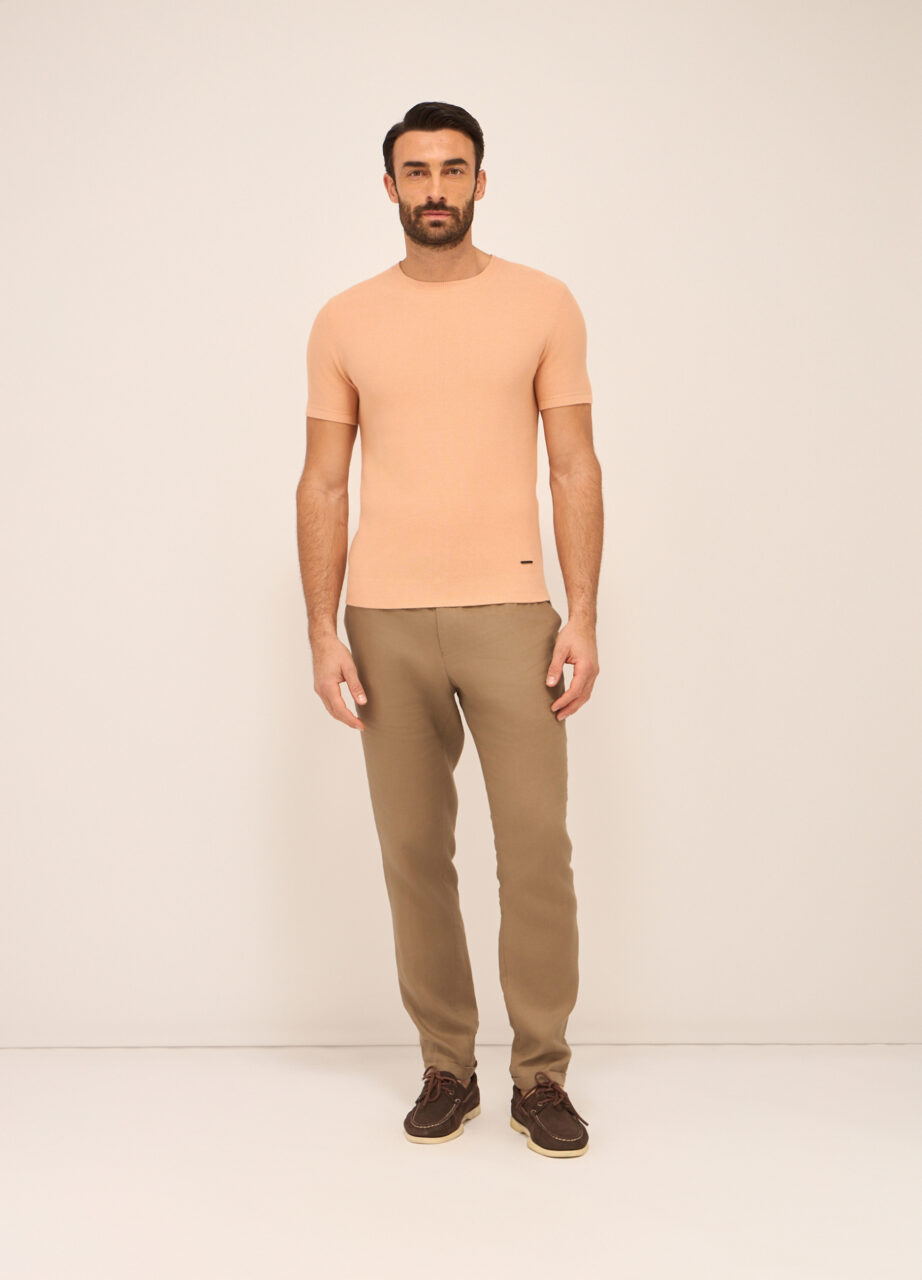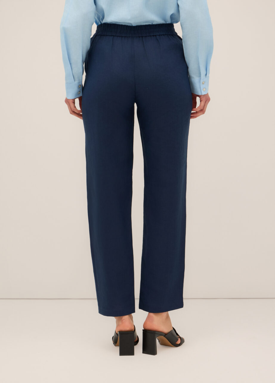 Hlače od čistog lana s elastičnim pojasom straga i vezicom sprijeda. Dva američka džepa. Jednobojne.