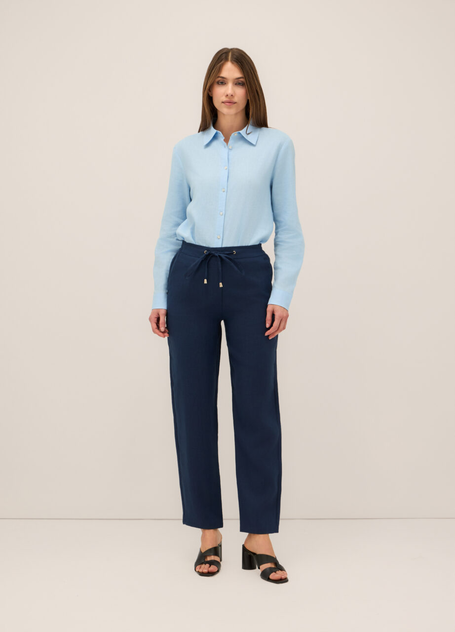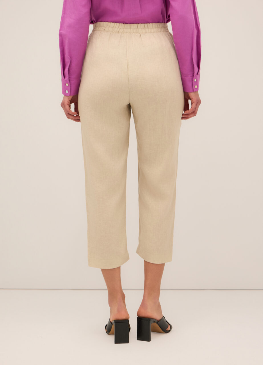 Hlače od čistog lana s elastičnim pojasom i dva američka džepa sprijeda. Jednobojne.
