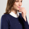 Kardigan od mješavine viskoze s okruglim izrezom i kopčanjem na dugmad. Manžetne s prorezom. Jednobojan. Ovratnik, donji dio i manžetne su ribani.