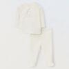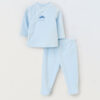 Set od mješavine velura i pamuka sastoji se od majice s preklopom i dugmetom. Okrugli izrez u obliku slova V i štampa naprijed. Tajice sa elastičnim pojasom u jednobojnoj boji.