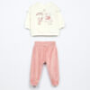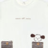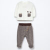 Set od mješavine velura i pamuka sastavljen od majice s okruglim izrezom, dugim rukavima i našivenim džepovima. Kopčanje na dugmad na leđima. Gačice s elastičnim pojasom i prugastim uzorkom. Našiveni dugmići.