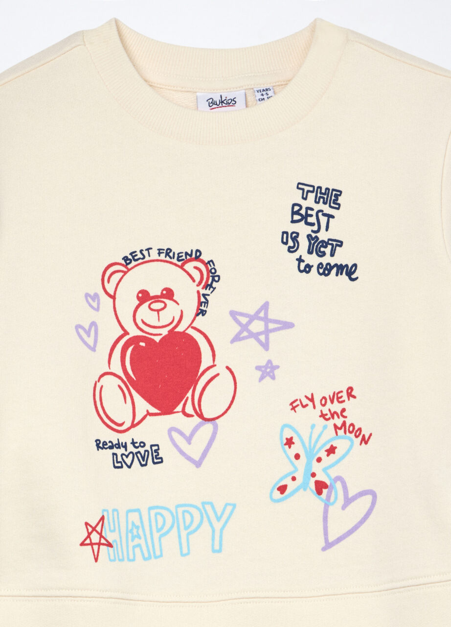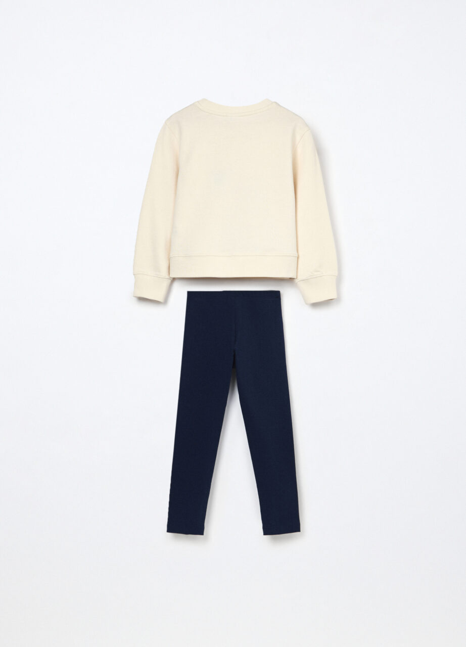 Set od french terry pamuka sastavljen od dukserice s printom sprijeda. Okrugli izrez, porub i manžetne od rebraste tkanine. Helanke s elastičnim pojasom, jednobojne.