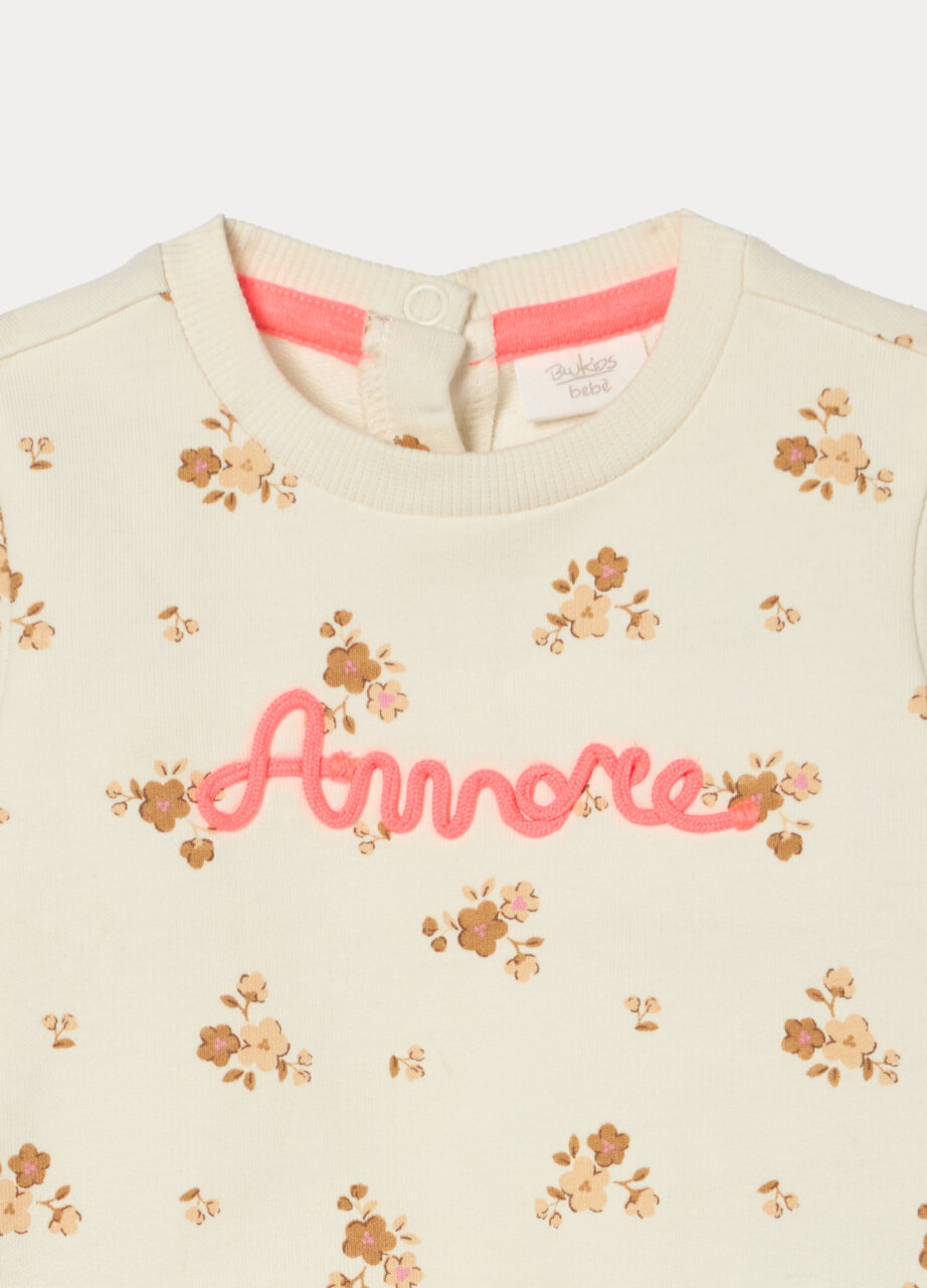 BABY SUITS, Komplet od čistog pamučnog frotira: top s cvjetnim printom po cijeloj površini i vezom. Okrugli izrez, donji rub i manžetne od rebraste tkanine. Kopčanje na dugmad na leđima. hlače s elastičnim pojasom, apliciranim volanima i manžetnama.