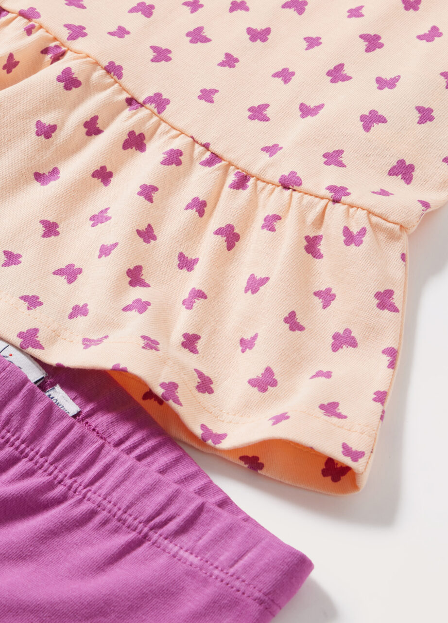 Komplet s dugim rukavima od čistog pamuka s printom u cijelosti i volanom na donjem dijelu. Okrugli izrez s otvorom na leđima. Koordinirane leggings hlače od jednobojnog rastezljivog pamuka s elastičnom strukom., TWO PIECES SET