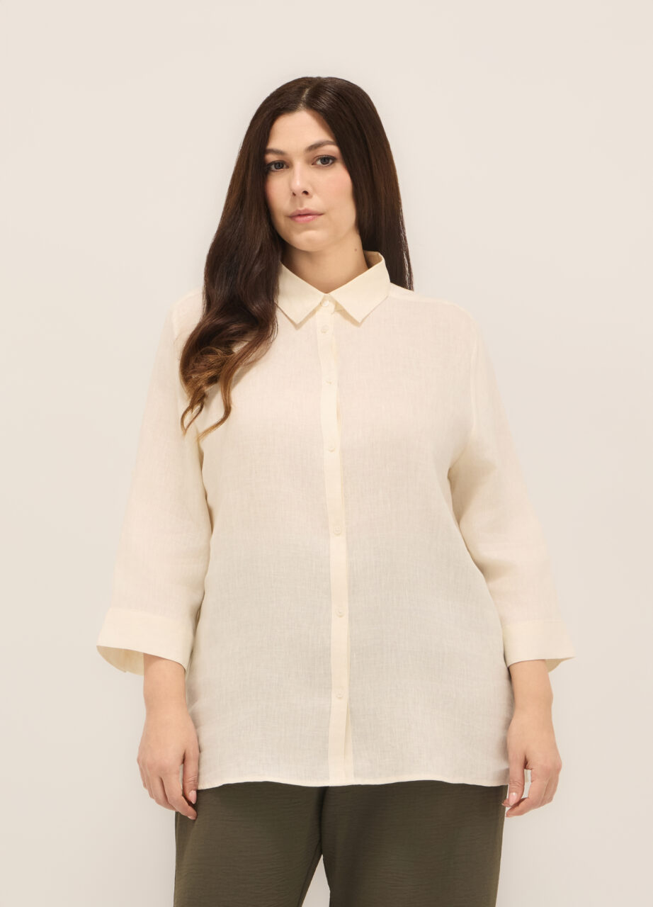 Košulja od čistog lana s francuskim ovratnikom i kopčanjem na dugmad. Rukavi 3/4. Jednobojna.