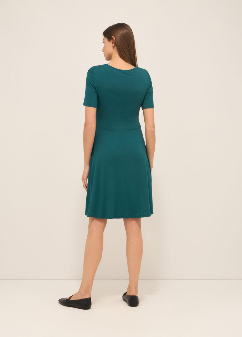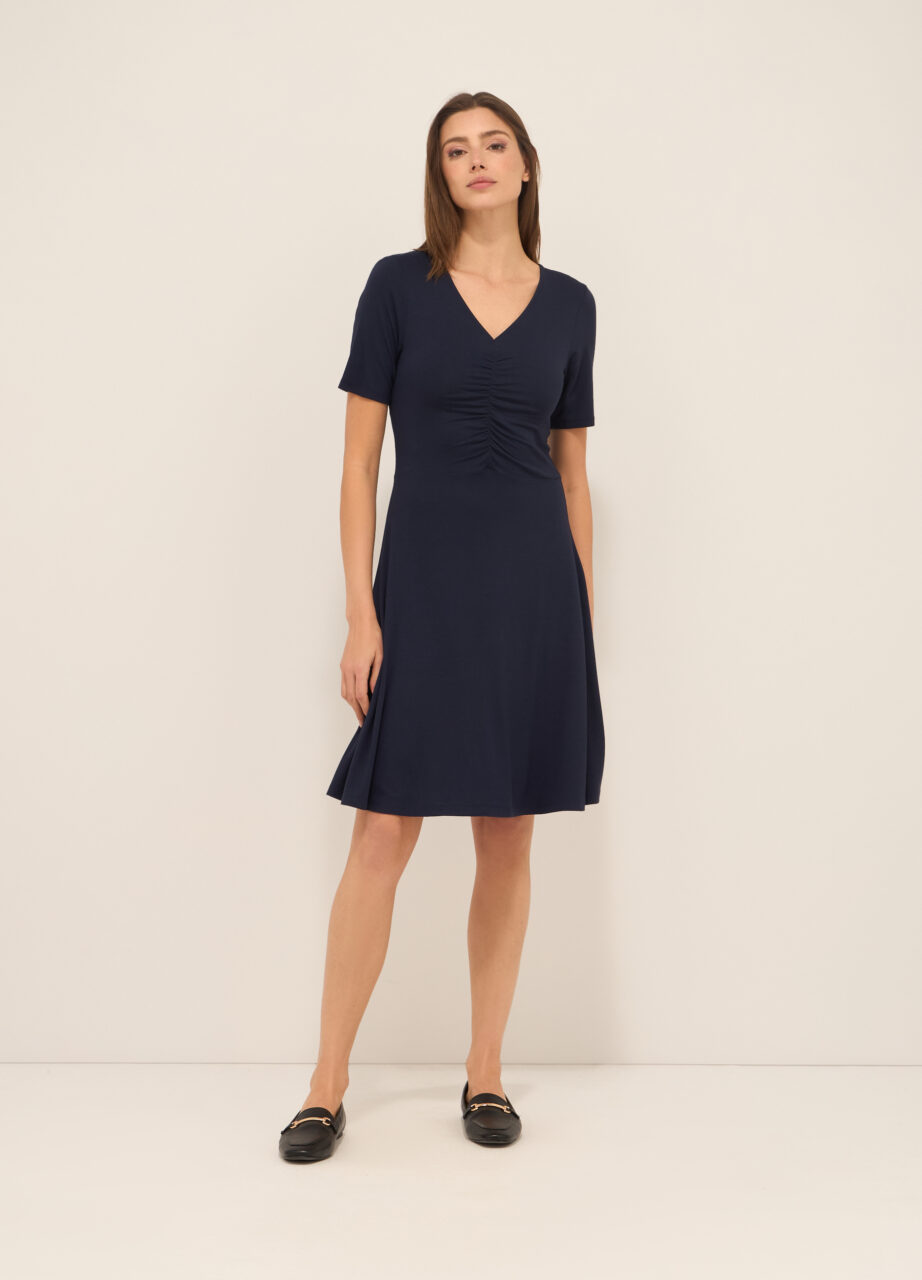 WOMEN’S WOVEN DRESS, Kratka haljina od rastezljivog viskoznog dresa sa V-izrezom i kratkim rukavima. Pikado na prednjoj strani. Jednobojna.