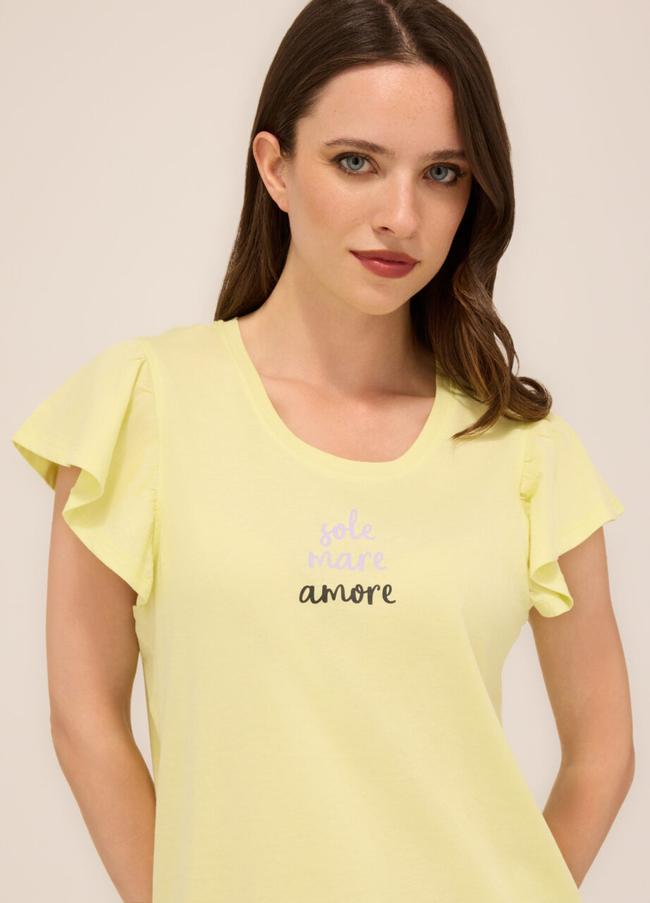 WOMEN’S PYJAMAS, Kratka pidžama od čistog pamučnog jerseya, sastoji se od majice s okruglim izrezom i kratkim rukavima s volanima. Štampa sprijeda. Šorc s elastičnim pojasom i dezenom po cijeloj površini.