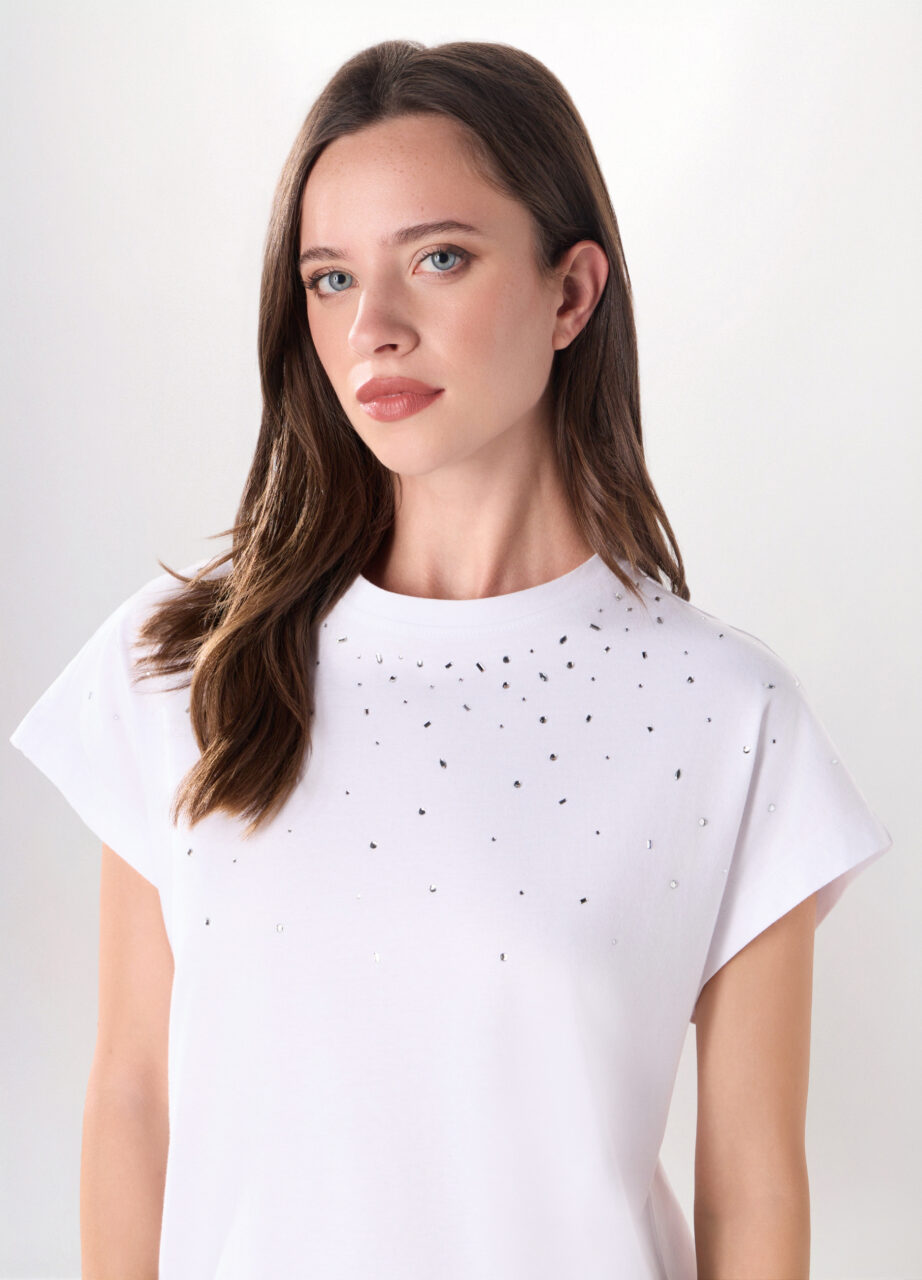 Majica od čistog pamučnog jerseya s cirkonima. Okrugli izrez i kratki rukavi.