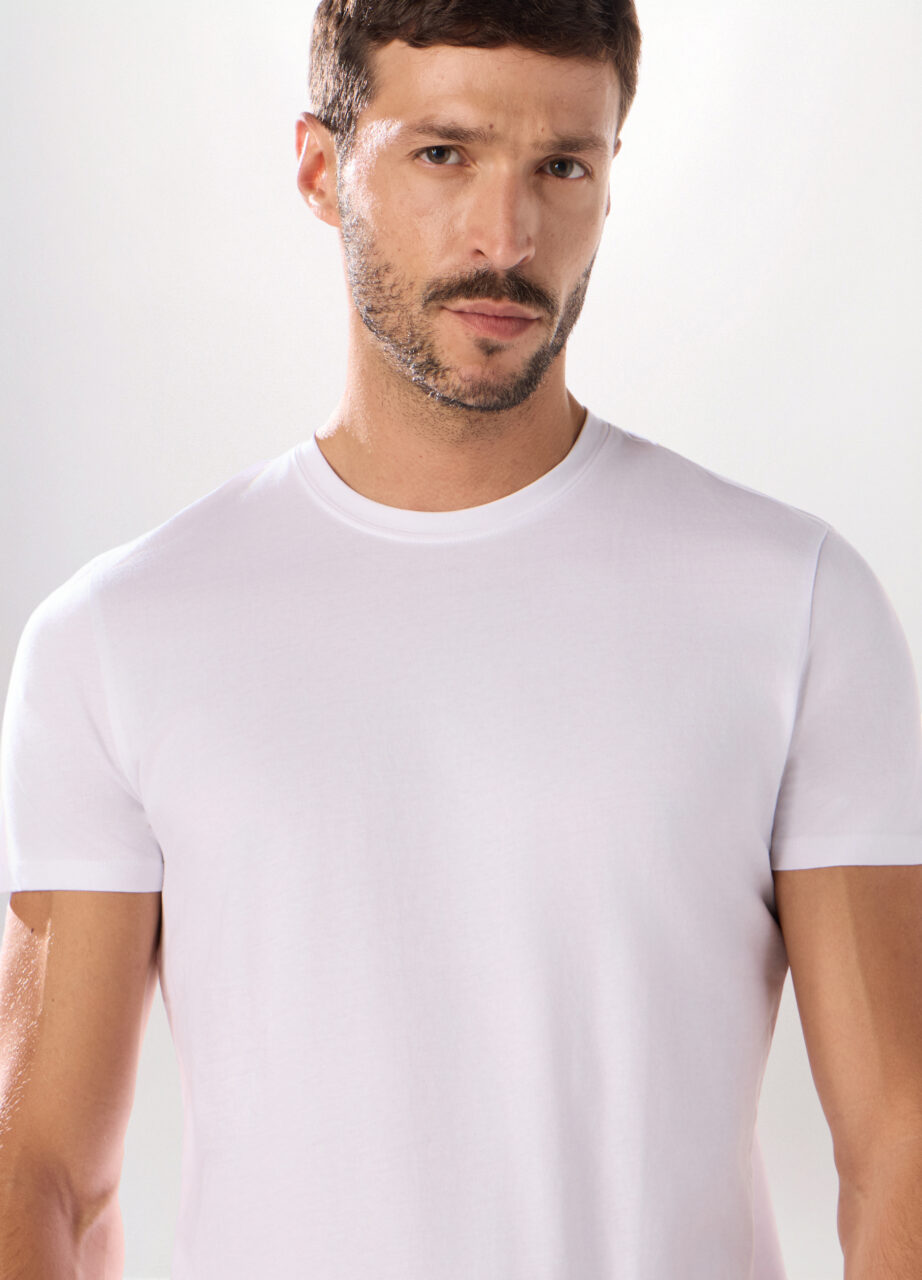 Majica kratkih rukava od čistog bijelog pamučnog jerseya: mekana i lagana tkanina pruža dugotrajnu svježinu i udobnost. Okrugli izrez i regular kroj.