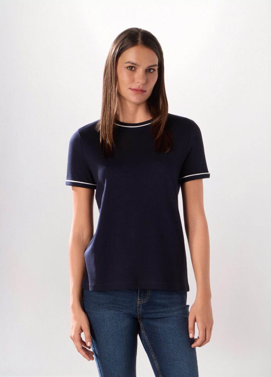Majica od interlock pamučnog platna sa okruglim izrezom i kratkim rukavima. Izrez i raglan rukavi sa kontrastnim obrubom.