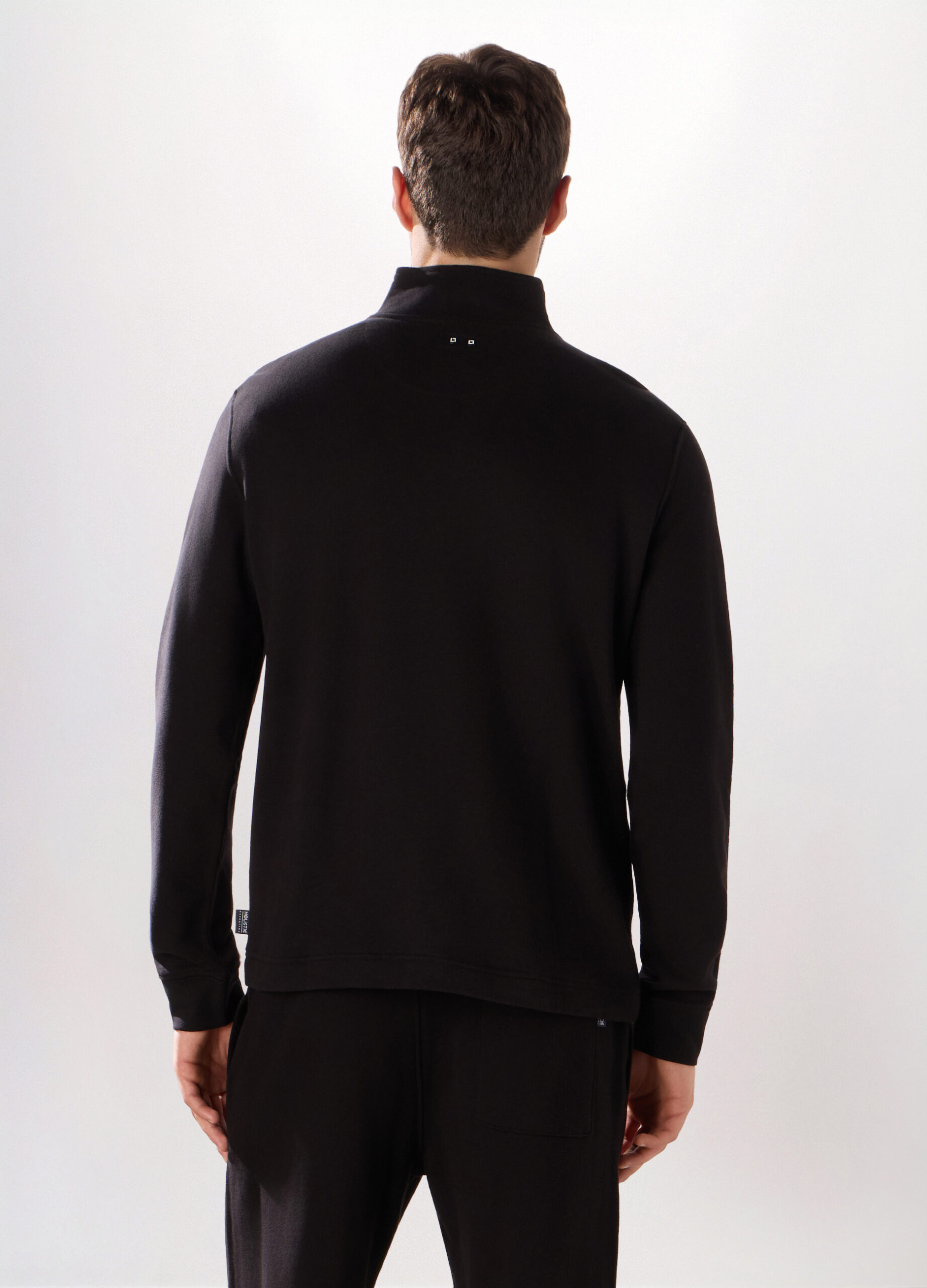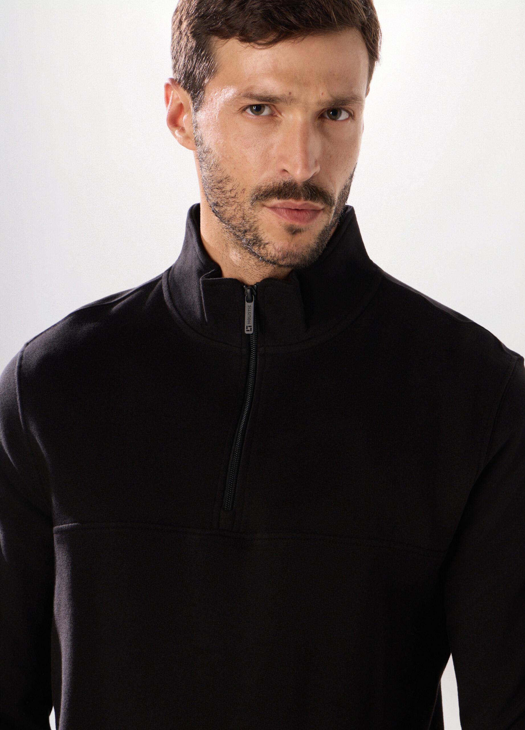 Dukserica crna, topla i mekana sa dugim rukavima i klasičnom kragnom sa rajsferšlusom do pola vrata: otvara se sprijeda zahvaljujući udobnom rajsferšlusu. Prirodna tkanina od čistog pamuka je mekana na dodir i pomaže regulaciju temperature, za što bolje uživanje u trenucima odmora i fizičke aktivnosti.
