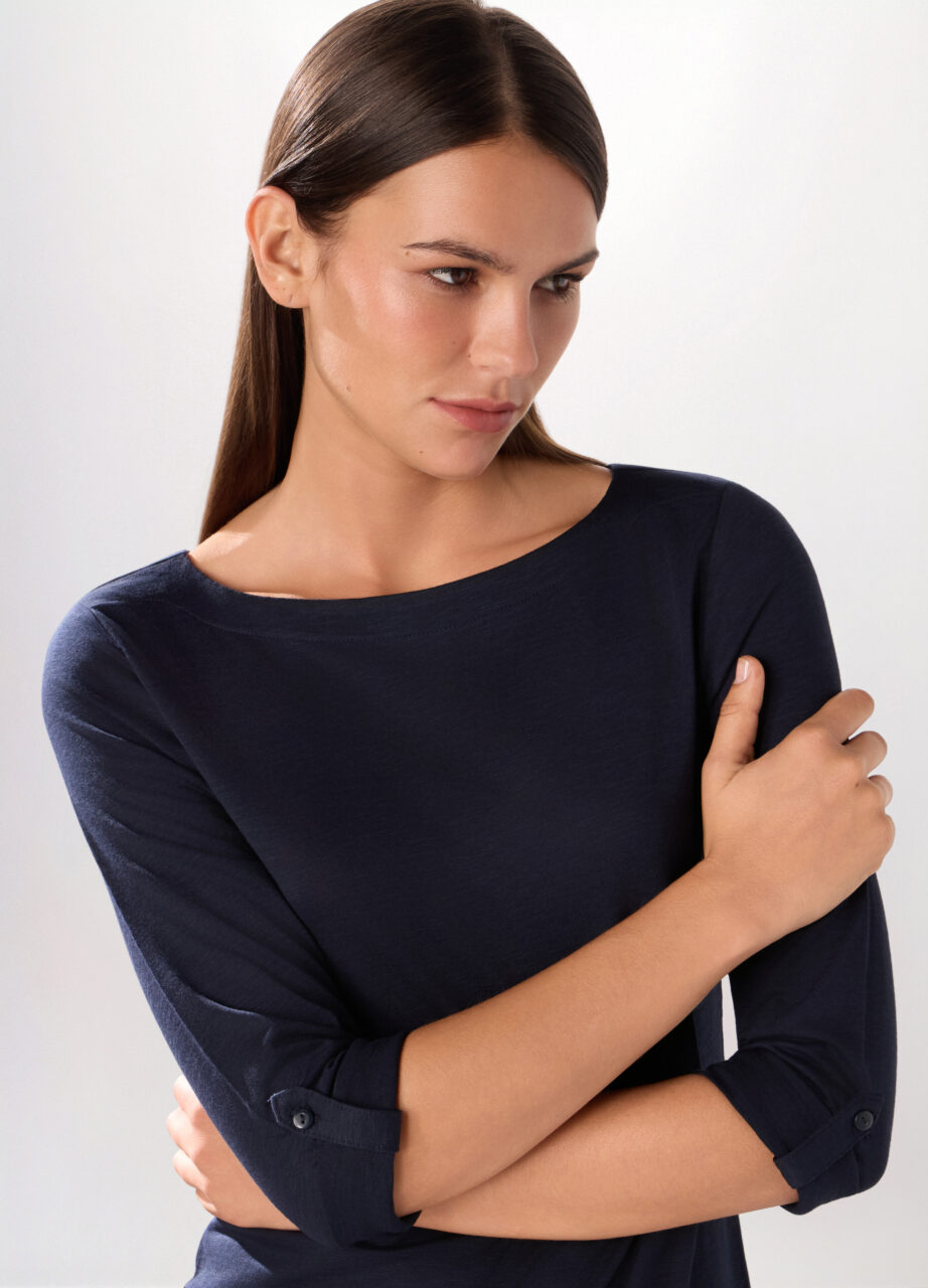 Majica od slub jerseya u mješavini pamuka, s okruglim izrezom i dugim rukavima. Manžetne s preklopom i ukrasnom trakom. Jednobojna.