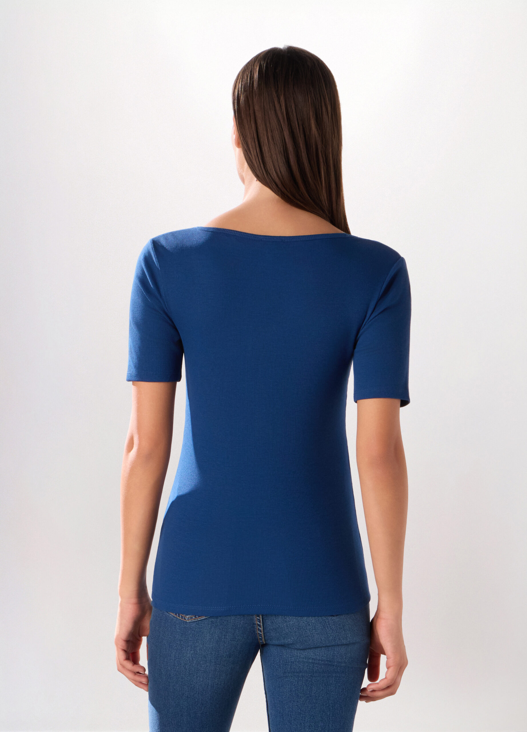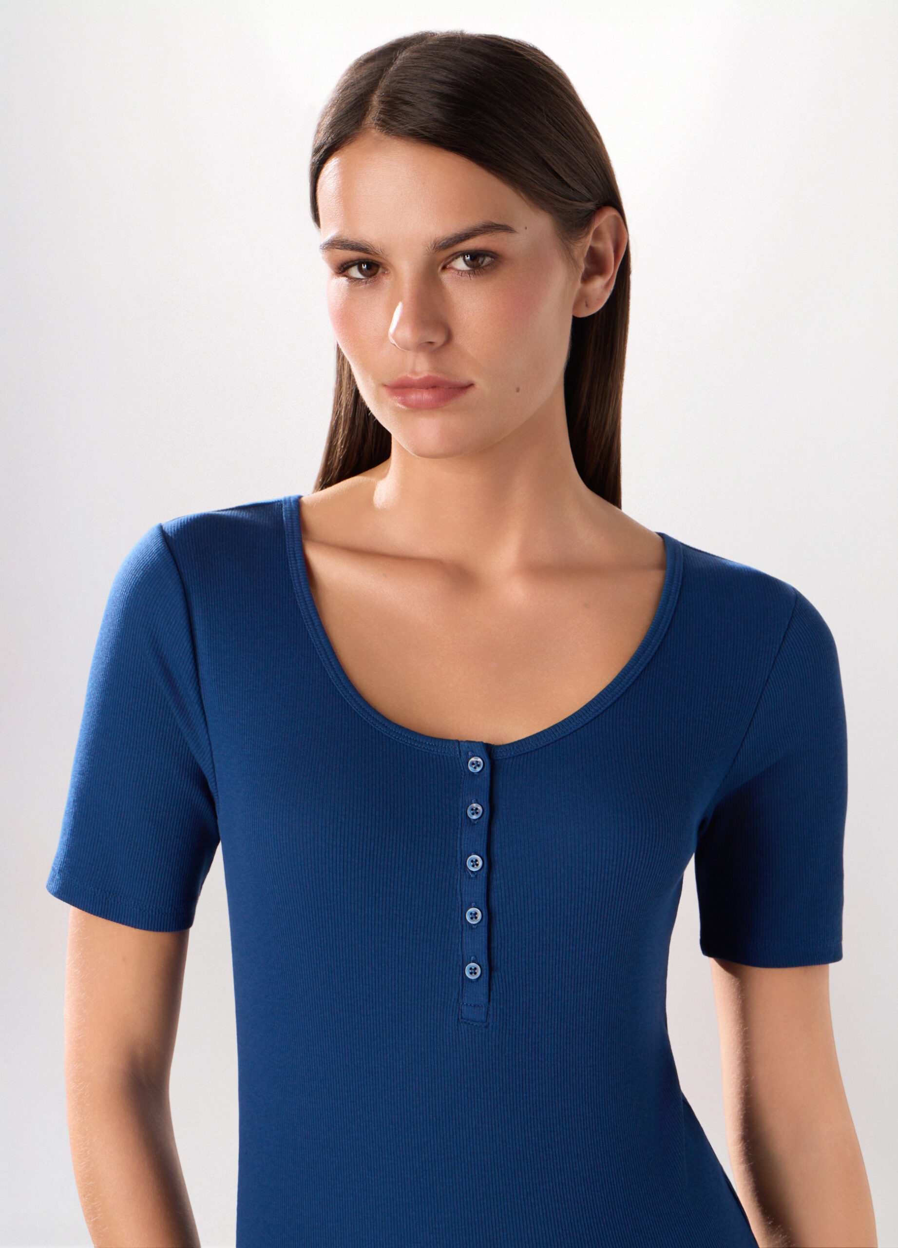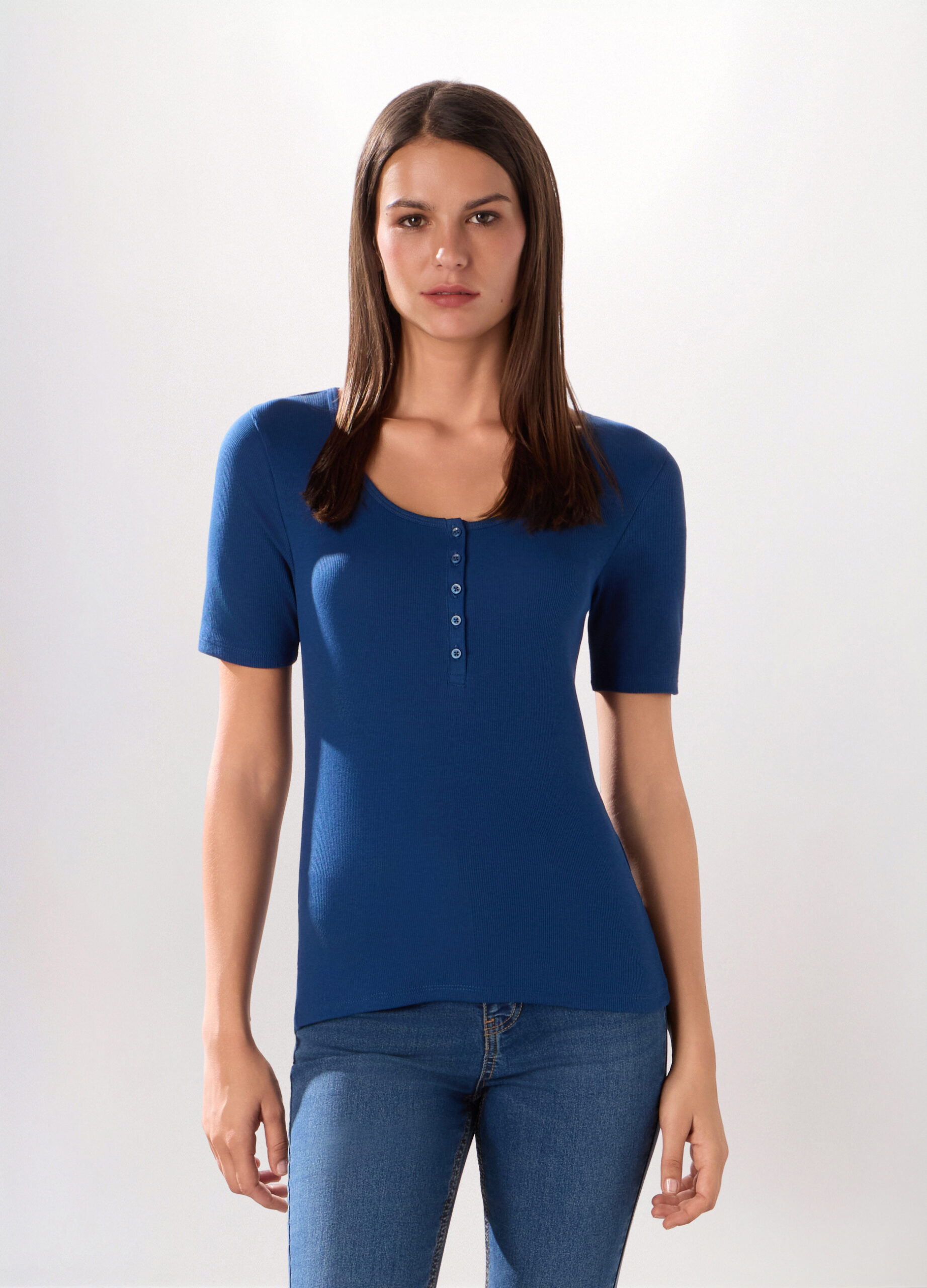 Majica od rebrastog rastezljivog pamuka s okruglim izrezom i djelimičnim kopčanjem na dugmad. Kratki rukavi. Jednobojna.