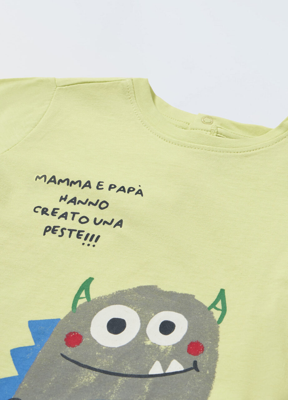 Majica od čistog pamuka s dugim rukavima i printom sprijeda. Okrugli izrez u rebrastom stilu i zatvaranje na dugme s leđa.