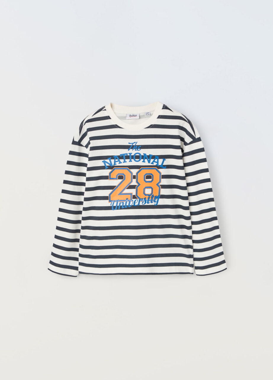Majica dugih rukava od čistog pamuka s prugastim uzorkom i printom sprijeda. Okrugli izrez u rebrastoj tkanini.