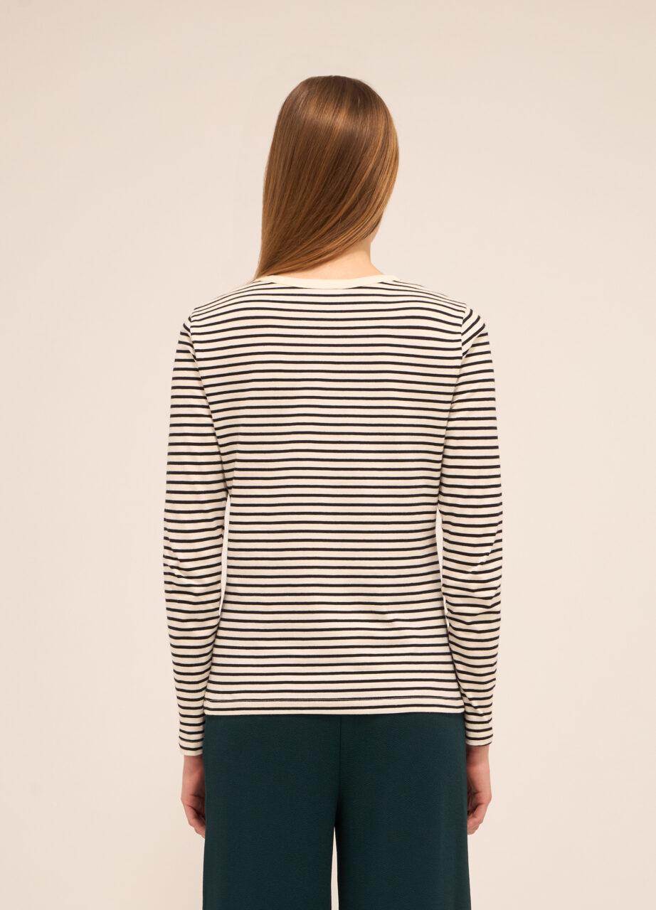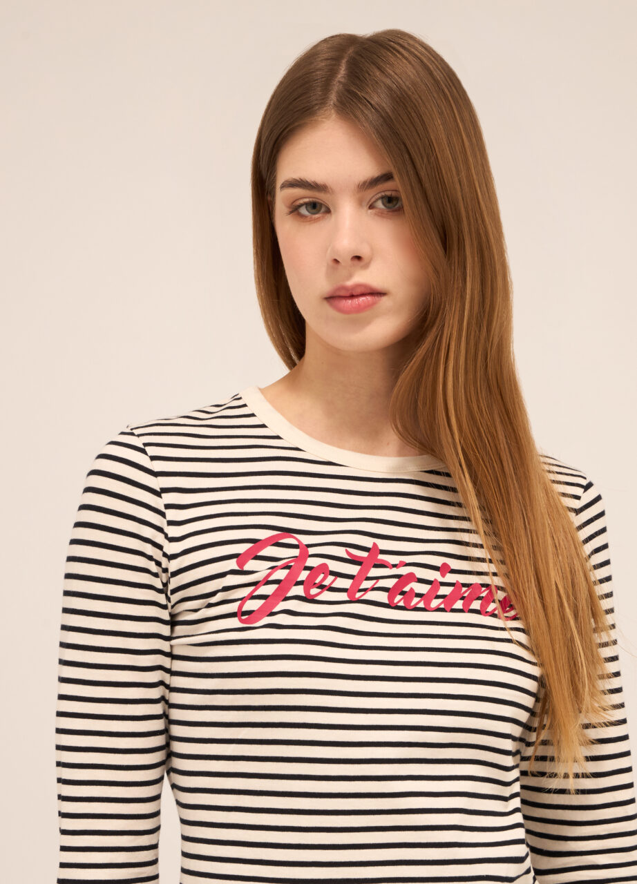 WOMEN’S T-SHIRT, Majica od čistog pamuka u džersi tkanju sa okruglim izrezom i dugim rukavima. Pruge po cijeloj tkanini i print.