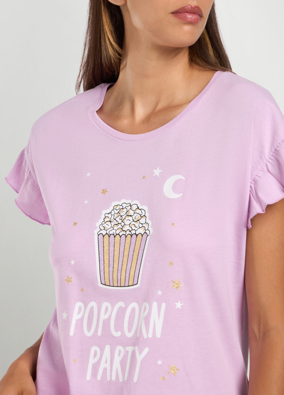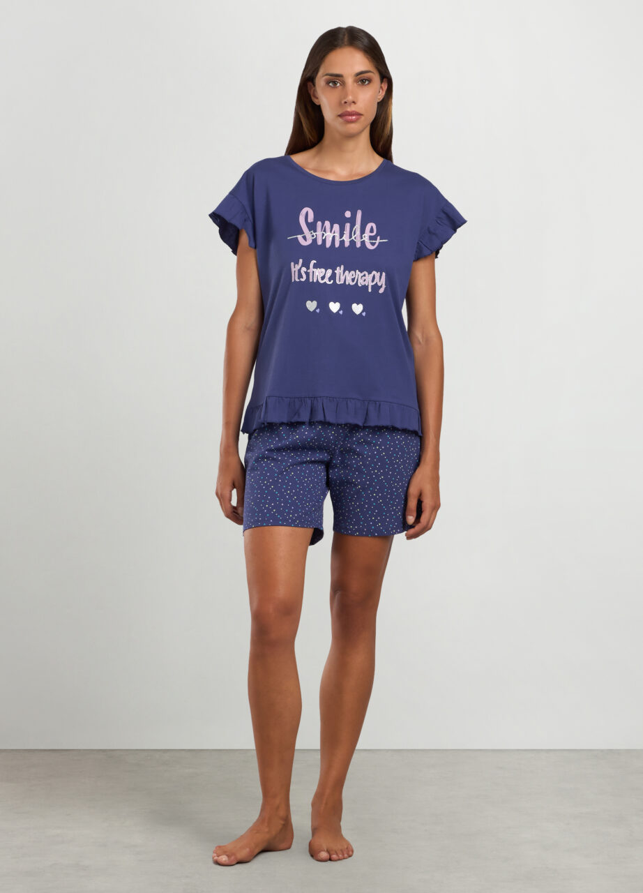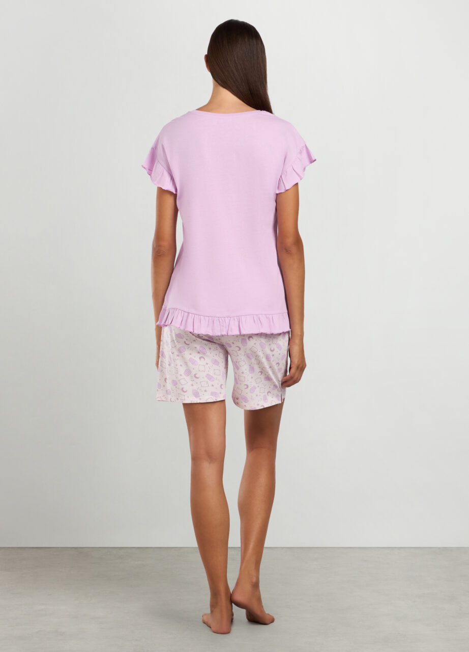 Set pidžame od čistog pamuka s glitter printom na topu, volanima na rubovima i šortsevima s elastičnim strukom i printom.