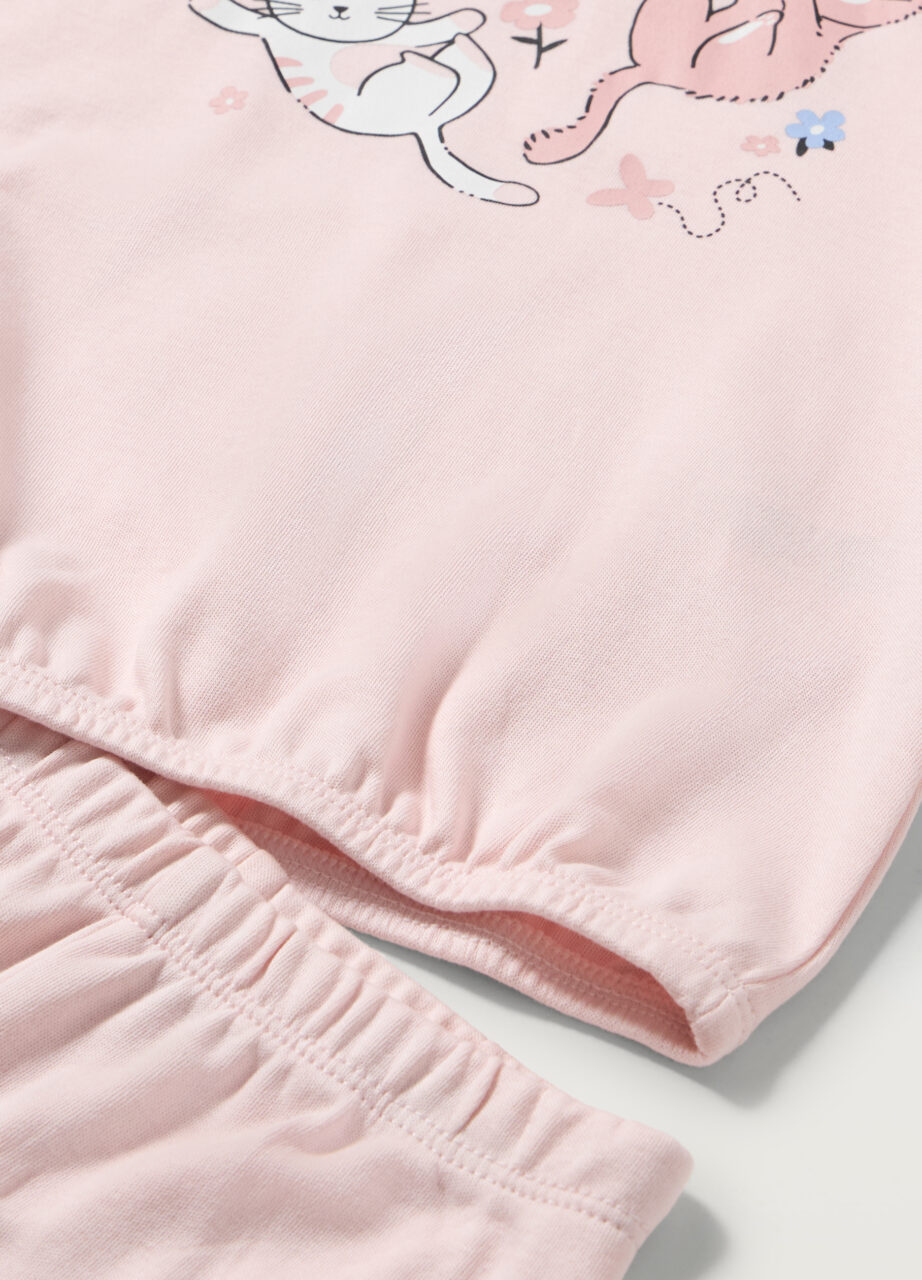 Pidžama od interlock čistog organskog pamuka koja se sastoji od gornjeg dijela s okruglim izrezom i kopčanjem na dugmad na leđima. Dugi rukavi i elastične manšete. Otisak naprijed. Jednobojne Hlače s elastičnim strukom i manžetama., PYJAMAS