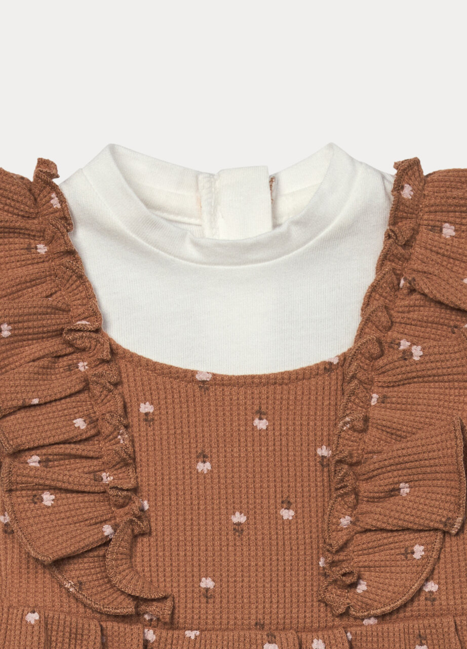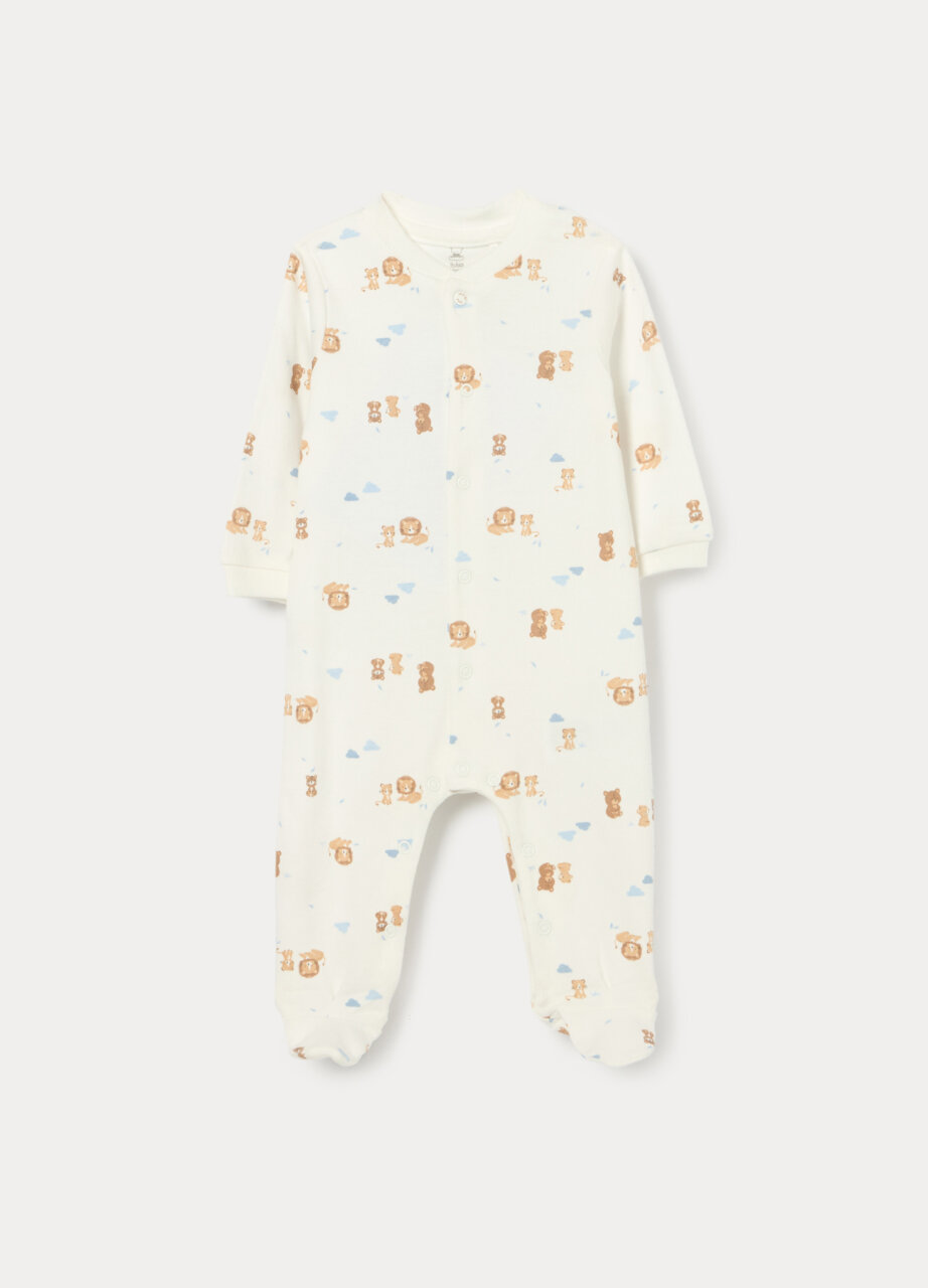 BABY DAY, Pidžamica sastavljena od topa s okruglim izrezom od čistog pamuka i dugim rukavima. Tregerice s printom po cijeloj površini i apliciranim volanima. Kopčanje na rajsferšlus na leđima.