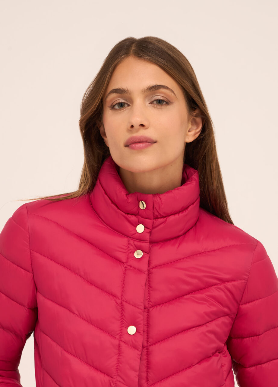 WOMEN’S LONG JACKETS, Jakna sa punjenjem sa dugmadi i visokim ovratnikom. Jednobojno.