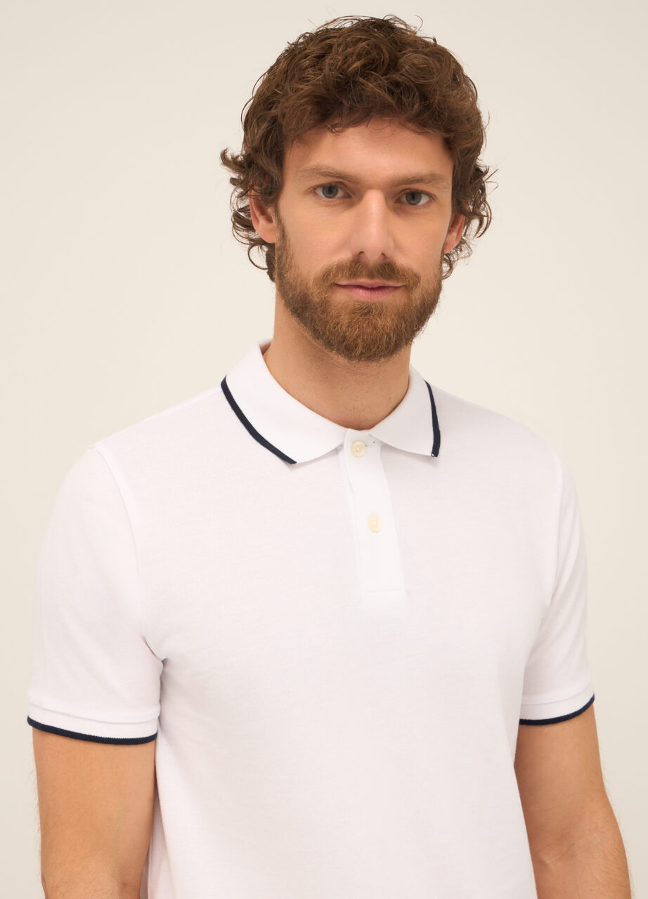 MEN’S POLOSHIRTS, Bijela polo majica od čistog pamuka karakteristične prefinjene teksture kontrastnog profila na kragni i kratkih rukava. Kragna sa dva dugmeta.