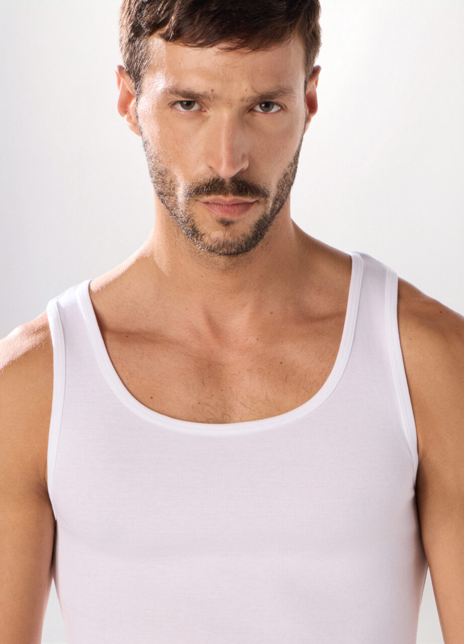 Potkošulja sa širokim okruglim izrezom, od čistog bijelog pamuka s klasičnim rebrastim pletenjem za mekoću i udobnost. Uski kroj pristaje uz tijelo.