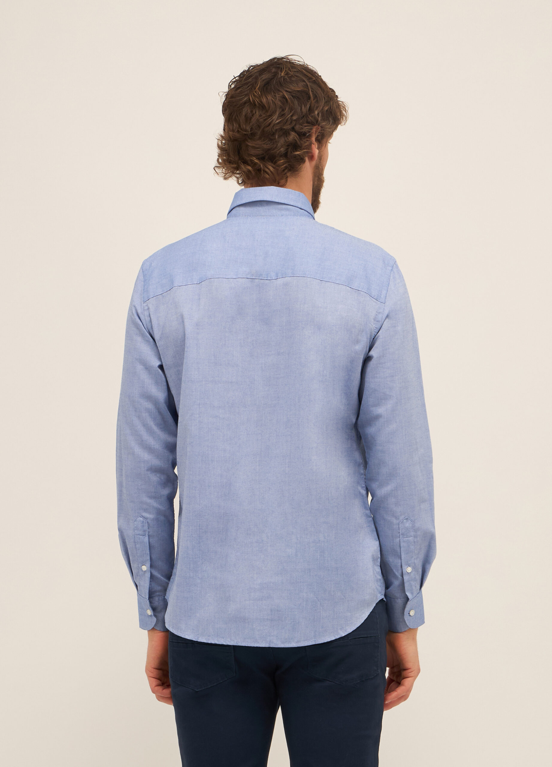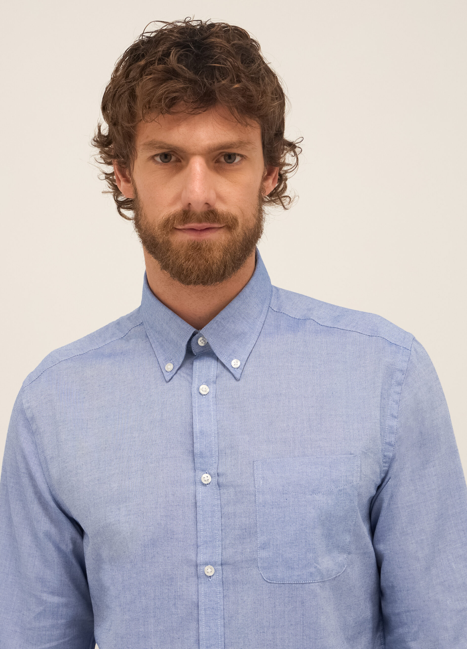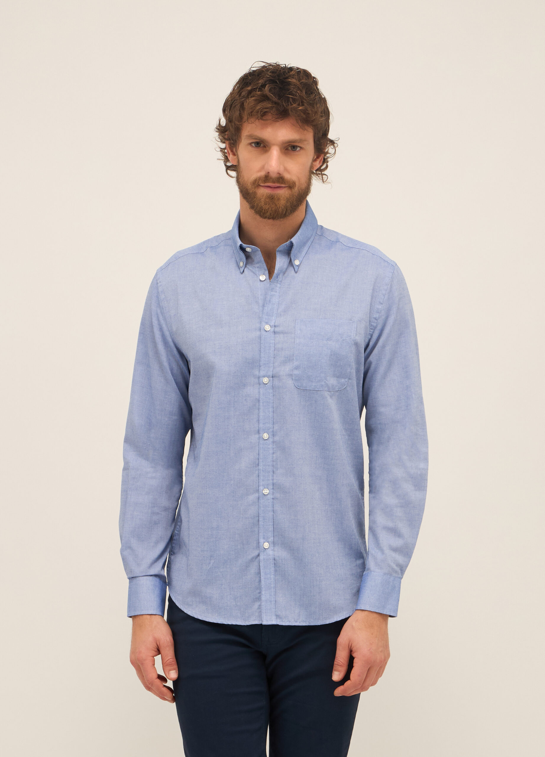 MEN’S CASUAL L/S SHIRTS, Košulja dugih rukava od svijetloplave mješavine pamuka s nepogrešivim izgledom zahvaljujući kragni na kopčanje i džepu na grudima. Normalan kroj i tkanina s Oxford efektom.