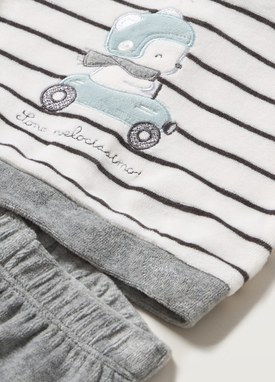 Set od velura od mješavine pamuka sastavljen od topa s okruglim izrezom, prugastim uzorkom i vezom. Zatvaranje na dugmadi na leđima. Tajice s elastičnim pojasom u jednobojnoj boji., TWO PIECES SET