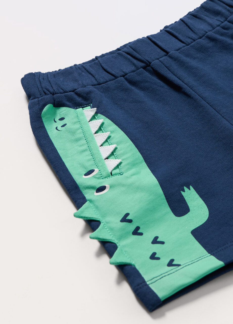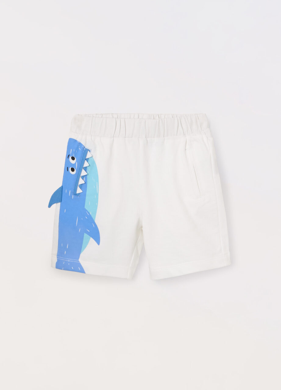 Šorc od french terry pamuka s elastičnim pojasom. Dva ušivena džepa s 3D aplikacijama i printom.