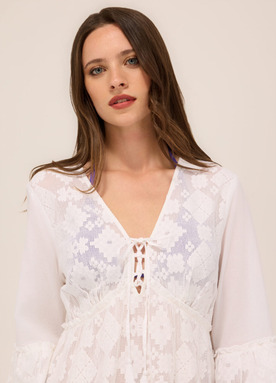 Pareo od mješavine pamuka s jacquard izradom, rukavi 3/4. V-izrez s vezicom.