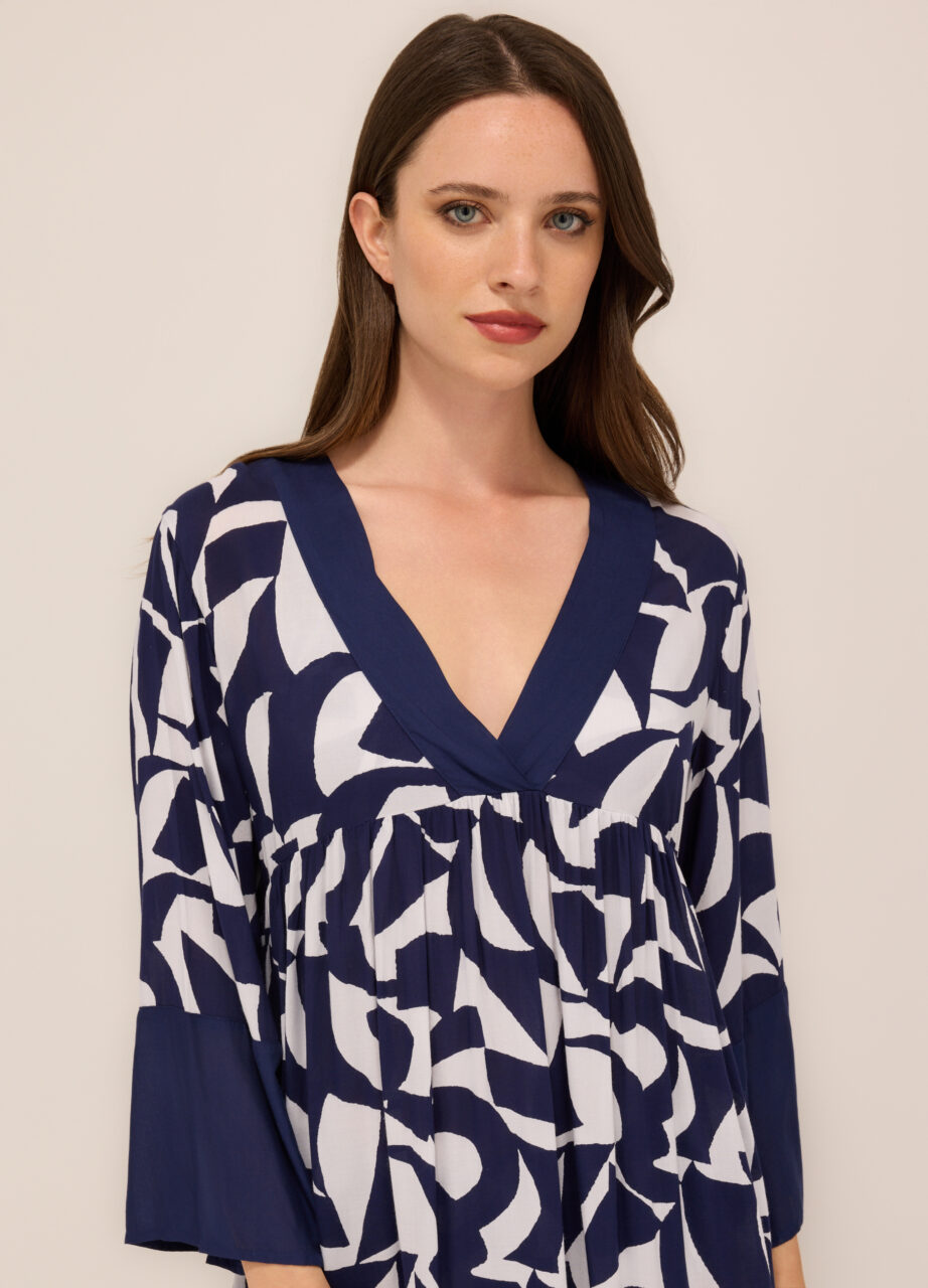 Pareo od popelina od čiste viskoze sa štampom s uzorkom po cijeloj površini. V-izrez i rukavi 3/4.